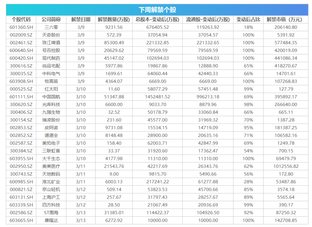 从解禁市值来看,3月9日是解禁高峰期,8家公司解禁市值合计219.04亿元,占下周解禁规模48.46%。按3月6日收盘价计算,解禁市值居前三位的是:奥美医疗(101.26亿元)、珠江啤酒(57.75亿元)、现代制药(44.11亿元)。从个股的解禁量看,解禁股数居前三位的是:珠江啤酒(8.53亿股)、中国国航(5.13亿股)、现代制药(4.51亿股)。