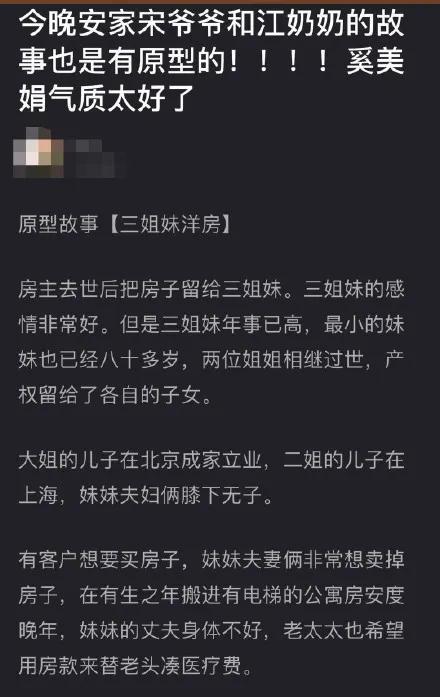 有网友爆料,原来这个“江家花园”的故事也是有原型的。原型故事中,房产也归三姐妹所有,大姐和二姐相继去世,儿子分别在北京和上海。三姐妹中最小的妹妹夫妇俩没子女。有人想要买这套房产,妹妹很想卖掉房子,搬进电梯房,用房款给爱人凑医药费。