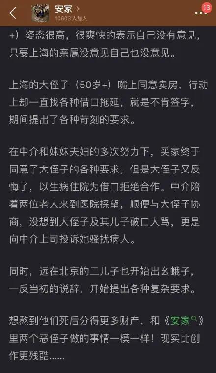 但是后续发展却很不顺利,北京的外甥一开始表示没有意见。上海的外甥嘴上说同意,但实际上一直找借口拖延,不签字还提出各种苛刻要求。妹妹夫妇满足了他提出的各种要求之后,上海的外甥又以生病住院为借口反悔,中介陪妹妹夫妇去医院探病,还被这个外甥及家人一顿大骂,中介还惨被投诉。
