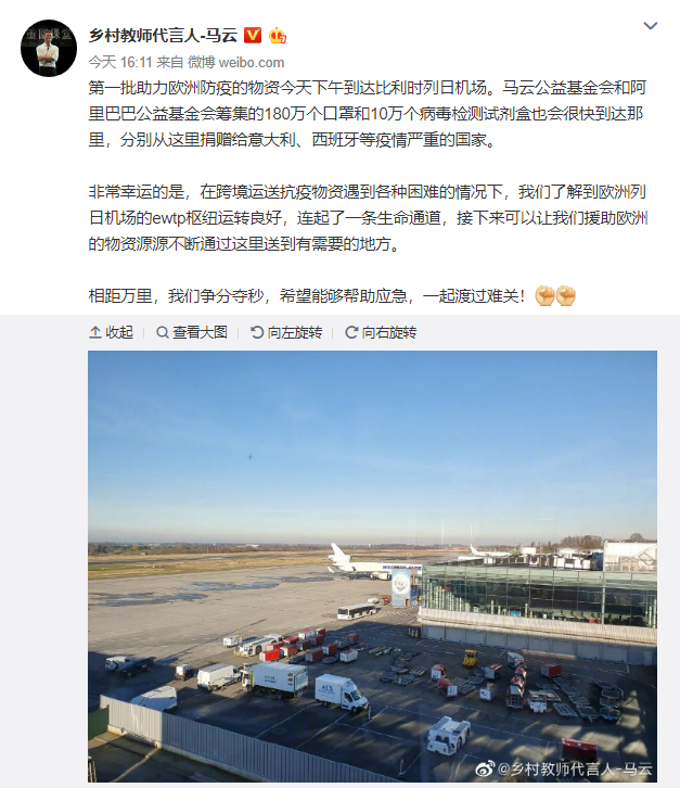 3月11日消息,马云在微博表示,第一批助力欧洲防疫的物资今日下午到达比利时列日机场。而由马云公益基金会和阿里巴巴公益基金会筹集的180万个口罩和10万个病毒检测试剂盒将很快到达,分别从这里捐赠给意大利、西班牙等疫情严重的国家。 “非常幸运的是,在跨境运送抗疫物资遇到各种困难的情况下,我们了解到欧洲列日机场的ewtp枢纽运转良好,连起了一条生命通道,接下来可以让我们援助欧洲的物资源源不断通过这里送到有需要的地方。”马云写道。 在微博的最后,马云表示:“相距万里,我们争分夺秒,希望能够帮助应急,一起渡过难关!” 今天早些时候,据日本媒体报道称,阿里巴巴集团创始人马云向日本东京都捐赠了10万个口罩。随着新型冠状病毒疫情的扩大,东京都内的口罩持续短缺。这批口罩的发放对象和时间将由东京都政府决定。 事实上,这已经是马云第二次向日本捐赠口罩了,之前马云在微博上表示,旗下公益基金会、阿里巴巴公益基金会捐赠100万只口罩用于支持日本“抗疫”。 3月6日马云在个人微博上表示,这几天通过多方努力筹集到了100万只口罩,会尽最大努力火速发往伊朗首都德黑兰。 马云表示:“这几天我们又多方努力,筹集到了100万只口罩,虽然路途遥远,运送相当曲折,但是我们会尽最大努力....火速发往德黑兰,希望这些物资能够缓解燃眉之急,能够保护那里的孩子,希望疫情尽快结束,世界安康。”