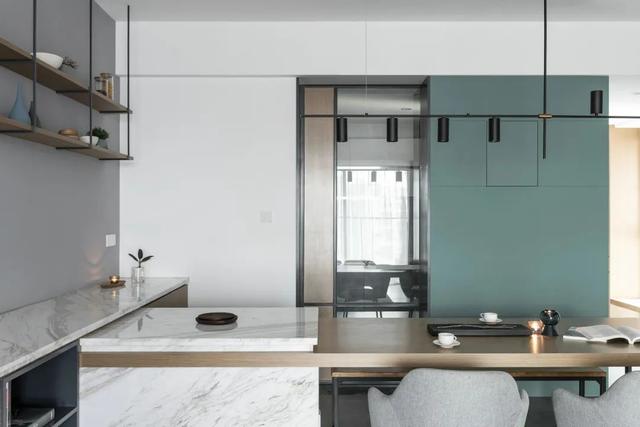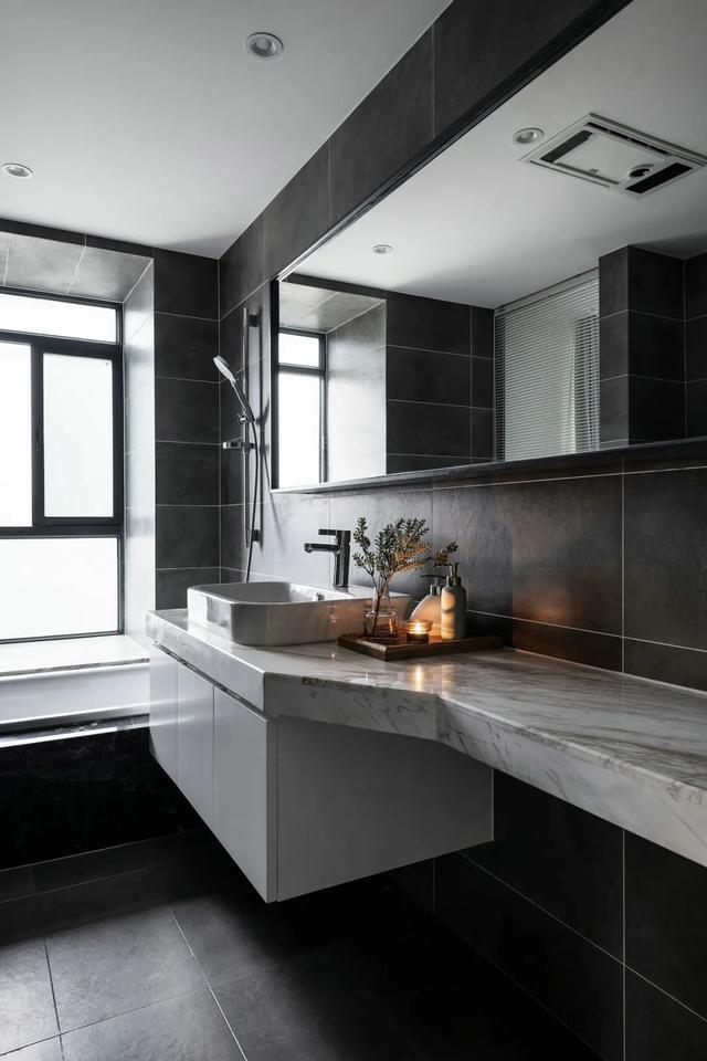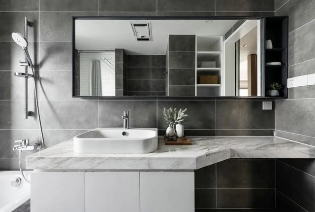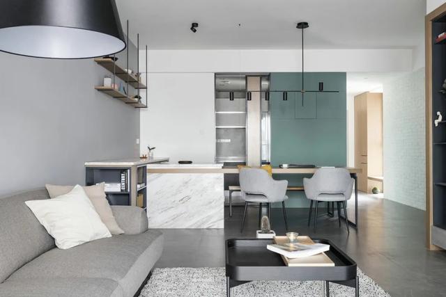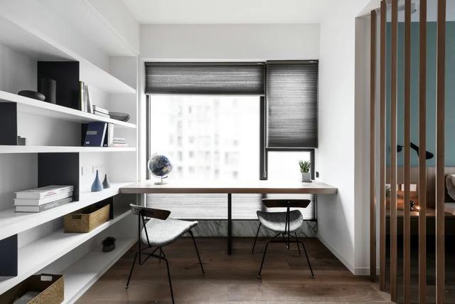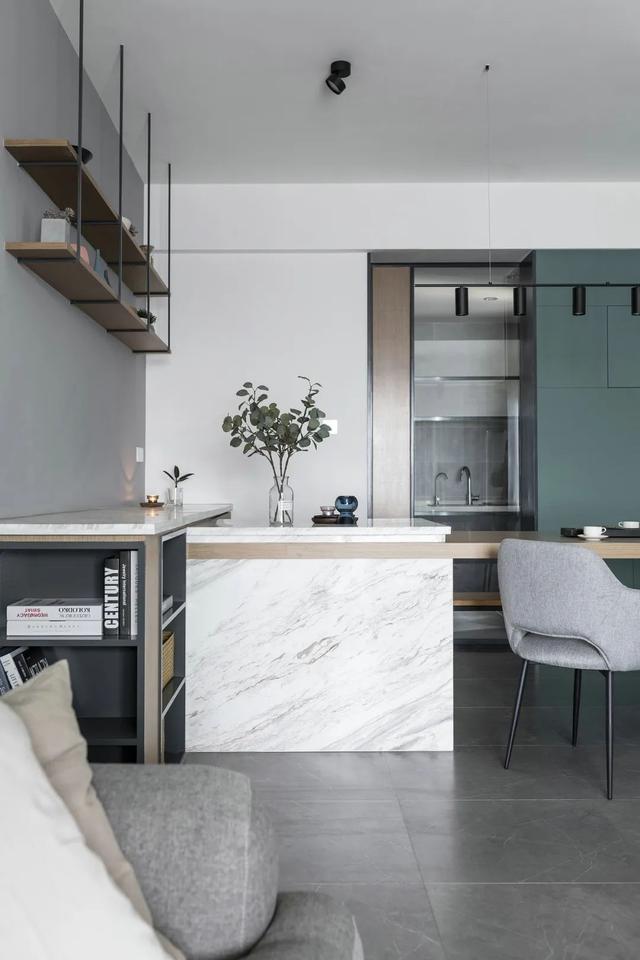 这是一套130平米的现代简约风格装修案例,整体空间以简约精致的文艺气质,搭配出一种轻松自然的舒适居住氛围,给人以惬意从容的生活气息。 客厅 ▲客厅电视墙以灰色定制电视柜,左侧是一列的黑色开放收纳书架,中间简洁的墙面挂上电视机,让客厅显得充满轻松自然的氛围感。 ▲客厅浅灰的墙面基础,布置上暖灰色素雅的布艺沙发,角落布置落地灯,让客厅显得充满自然优雅的气质感。 ▲黑色托盘茶几布置,摆上木质茶盘,布置精致的茶具装饰,让空间显得充满自然舒适的优雅气息。 餐厅 ▲餐厅挨着客厅的格局,餐桌挨着一个大理石岛台设置,让用餐体验更加优雅时尚。 ▲大理石台面的餐边柜与岛台,餐边柜上方装着小资格调的吊架,让,岛台与餐桌融为一体的设计,显得简约优雅而情趣。 ▲厨房门旁的淡蓝色的黑板墙,也让空间显得情趣雅致。 卧室 ▲卧室在暗蓝色的床头墙基础,布置现代简约的床铺,整体自然雅致的质感,让睡眠氛围安静而舒适惬意。 书房 ▲书房与卧室隔着木质格栏,呈现出一种通透自然的时尚空间感。 ▲书房侧边定制了展示架书架,靠窗的双人位书桌布置,让主人在家办公也有个舒适明亮的空间。 卫生间 ▲卫生间整体以灰色的空间,洗手台的台面在进门处做了个缺角,在提供宽松的洗漱台的同时,也让进门处不会显得过于拥挤。 ▲靠窗的浴缸布置,兼顾了淋浴与泡澡功能,实用而舒适。