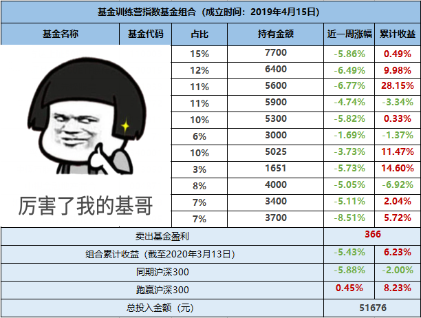 本周五,上证指数收报2887.43点,跌幅为1.23%。 基金训练营组合第62周战绩出炉:跌幅5.43%,累计收益6.23%,跑赢同期沪深300指数8.23%。 2019年4月份,基金训练营正式开启,5万实盘领投,9月份考虑到大盘仍在低位,实盘总仓位升级到10万元,目前仓位52%左右。 截止本周五,菜基实盘收益如下(不包含场内基金): 随着境外疫情的失控,本周全球股市暴跌,A股虽然跌得也不少,但在全球来看已经是扛把子一般的存在了。 菜基最近两周基本都在买债基,并没有加仓股市,主要是考虑当前保持5成左右的仓位已经够了,没有跌到足够便宜的位置,不适合加仓。 不过在本周五,由于大盘已经跌到2900点以下,是一个比较低的位置了,所以基金训练营加仓了一部分。 另外,最近因为油价的话题比较火,基金训练营有很多菜友咨询石油基金的情况,抄底之心跃然纸上。 但实际上,这里面有很多坑,今天菜基就和大家聊一聊。 看到上面这张图,有些菜友可能想要抄底石油,但抄底一定不能选错基金,石油基金如果选错的话,可能是个无底洞! 目前,市场上和石油相关的基金有两类: 一、投资石油开发公司的基金 这三只基金都是LOF基金,既可以在场外申购、赎回,也可以在场内买卖。 因为有些基金公司外汇额度已经用完了,这三只基金里面,目前场外只有华安标普石油指数基金是可以申购的。 场内三只基金均有不同程度的溢价,其中华宝油气溢价30%,我觉得应该是持有的投资者亏太多了,然后场外又不能补仓,只能在场内出高额的溢价买入。 华宝油气之前被很多大V推崇,现在跌得那叫一个惨不忍睹,基金净值现在只剩0.227,就这还是溢价了29.71%。 仔细算下来,实际净值只有不到0.20! 其实很多朋友买以上三只基金的时候,可能并不清楚基金买的是什么,只知道这些基金和石油相关。 事实上这三只基金买的都不是石油,而是石油开发公司的股票。 现在油价低迷,石油开发公司的业绩大概率是比较糟糕的,股价可不像油价,油价因为开采成本,以及政治原因,跌起来是有底的,石油开发公司的股价跌起来可是个无底洞。 其实石油开发、勘探公司我认为投资价值不高,这些公司技术含量低,业绩受油价影响大,很难实现稳定盈利,同时石油不是稀缺资源,油价根本不是石油开发公司能够左右的,实在不是一门好生意。 想要投资石油相关基金的话,还是直接买底层资产是石油的基金会更好一些。 二、石油基金 那么,哪些基金的底层资产是石油呢?菜基直接帮大家找了出来。 以上三只石油基金既可以在场外购买,也可以在场内购买。 目前场外的石油基金都已经暂停申购了,场内的石油基金因为场外暂停申购的关系,存在较高的溢价,不建议购买。 场外的石油基金,大家可以关注下南方原油C(006476),等可以申购的时候再入手。 最后菜基想和大家说的是,石油是个波动大,同时影响因素很多的投资品种。别说普通人了,很多专业投资者都未必能准确预估它未来的走势。 无论你是不是个专业投资者,都得明白:投资不一定要抓住所有机会! 事实上,你也不可能抓住所有机会,抓住那些自己看得懂的机会已经很好了!所以,如果你对石油基金不太了解,建议不要因为油便宜就买。 本周周报的主要内容就到这里,最后我想多说两句心里话。 这周五,我看到有菜友说:菜基搞这个基金训练营,收了会员很多钱,赚到手软,都够买套房了! 这位菜友可能是出于良好的祝愿来开我的玩笑,但讲心里话,菜基听完其实还挺不开心的。 为啥?因为我和我的团队现在根本就没赚钱! 目前训练营399一期,会员708一年,基本上是市面上最便宜的价格,按照100万首付来算,大家可以算一下要收多少人才够? 另外,为了做好训练营,菜基也不是一个人在战斗,现在收的这点钱,整个团队的人力成本都还没打平。 退一万步来说,假设菜基以后真的声名远播了,靠训练营的知识付费能赚到100万了,这在广州也根本够不到一套房子的首付啊…… 所以,菜基要完全坦诚地告诉大家:目前基金训练营还是在亏本的状态,我们希望未来能赚到钱,但这条路一定是靠收益、口碑和体验慢慢累积出来的,不是靠短期哄骗、收割用户来实现的。 各位也可以拿基金训练营的价格和服务去和行业里其他同类型机构的去对比,看看我们是不是“赚了大钱”。 总之,就像对基金投资本身的价值信仰一样,基金训练营是一项长期的服务事业。 如果你相信菜基,那欢迎你来,我会竭尽所能地教授基金投资方法,帮你在市场上赚得更多的收益。 如果你不相信我们,那也没关系,每个人都可以自由选择,但是没必要动不动就道德绑架。 更不要每次菜基长篇大论地分享完专业基金知识,在文末顺便宣传一下自己的课程和服务的时候,就留言说我们“只知道”打广告。 真正专业、有用、高价值的服务,是白嫖不到的! 最后发个通知: 708元基金会员再招最后一波!4月开始涨价啦! 送第七期基金训练营(售价399),超级划算! 错过这一波,也没什么~只是4月15日以后要涨到799元,也算不上贵。