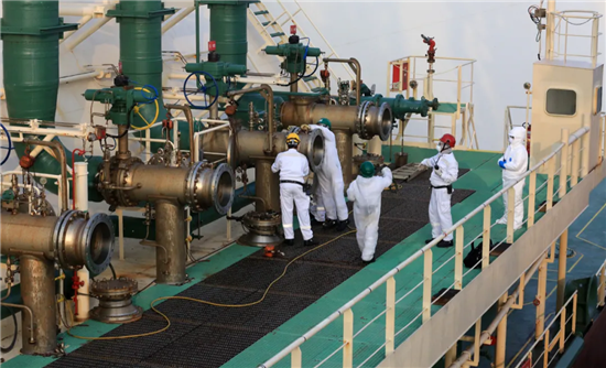 △通过信息手段,做到接驳“无接触” 船舶污染物处置方面,生活垃圾、生活污水需送交上岸处置的,须提前24小时向拟靠泊的港口码头、过驳区等报告,在疫情防控部门指导下,按要求采取必要的密封或消毒等措施后,交接收单位接收转运,一改过去可交由码头处置的模式。“必须是有资质认可的污染物接收单位才可接收。”徐巍说,否则一律不允许“下船”,坚决防止因污染物造成疫情传播。 强化协调联动,谨防“外输”不放松 口岸是防止境外病例输入的前沿阵地。早在3月3日,如东县口岸办公室根据口岸核心能力建设要求,结合当前疫情防控形势,建立了涉外疫情联防联控工作组。 “莫扎”号LNG轮靠妥后,两名如东海关工作人员登上“莫扎”轮,除了开展计量检验例行工作外,还对船方所有人员严格实施“三查、三排、一转运”检疫措施,做到百分之百查验健康申报,逐一开展体温监测筛查,严密实施医学巡查,坚决遏制疫情通过口岸传播扩散,筑牢口岸检疫防线。