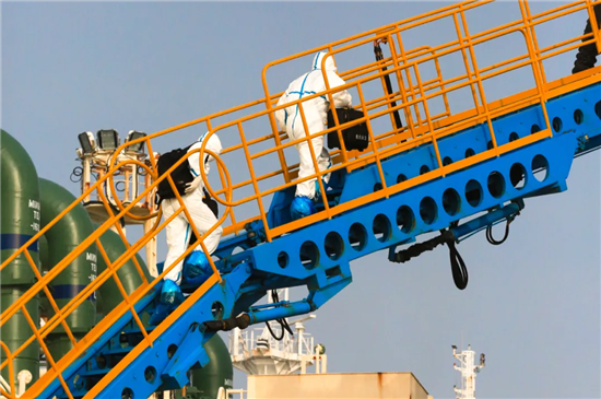 △卡塔尔籍LNG轮“莫扎”号靠妥如东口岸 “莫扎”号轮上共有32名船员,分别来自菲律宾、印度、克罗地亚等国家。在确认该船全体船员连续14天体温无异常后,接收站登轮人员和码头操作员需“穿齐”防疫五件套才可开展作业。“保证工作人员‘全副武装’安全作业。”吴小飞说,为此,公司从专业渠道紧急采购了一批防护服、护目镜、N95口罩、一次性手套、一次性防护服等一级防护用品,目前可满足接卸20船人员穿戴需求。
