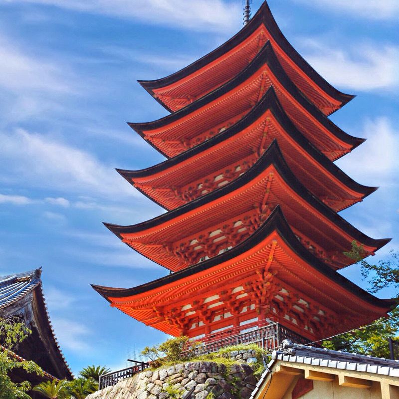 神社周围还有很多特产屋和餐厅!虔心参拜完之后,可以去宫岛表参道商店街逛逛。这里有很多宫岛特色和魅力十足的商店,非常适合购入特产哦。 0 2 千叠阁 千叠阁位于严岛神社内,是丰臣秀吉为祭奠战殁将士亡灵而建造的大经堂。正式名称称作丰国神社,是宫岛内最大建筑,面积相当于857张"叠"(榻榻米)大小,所以被称作千叠阁。 1587年,由于秀吉猝死而中止工程,除神像座上方以外都尚未建造天井,也没有板壁,以这种未完成状态保存至今。 千叠阁与相邻而建的五重塔交相辉映,也共同被指定为重要文化遗产,远远望去,真是一幅完美的画卷呢!