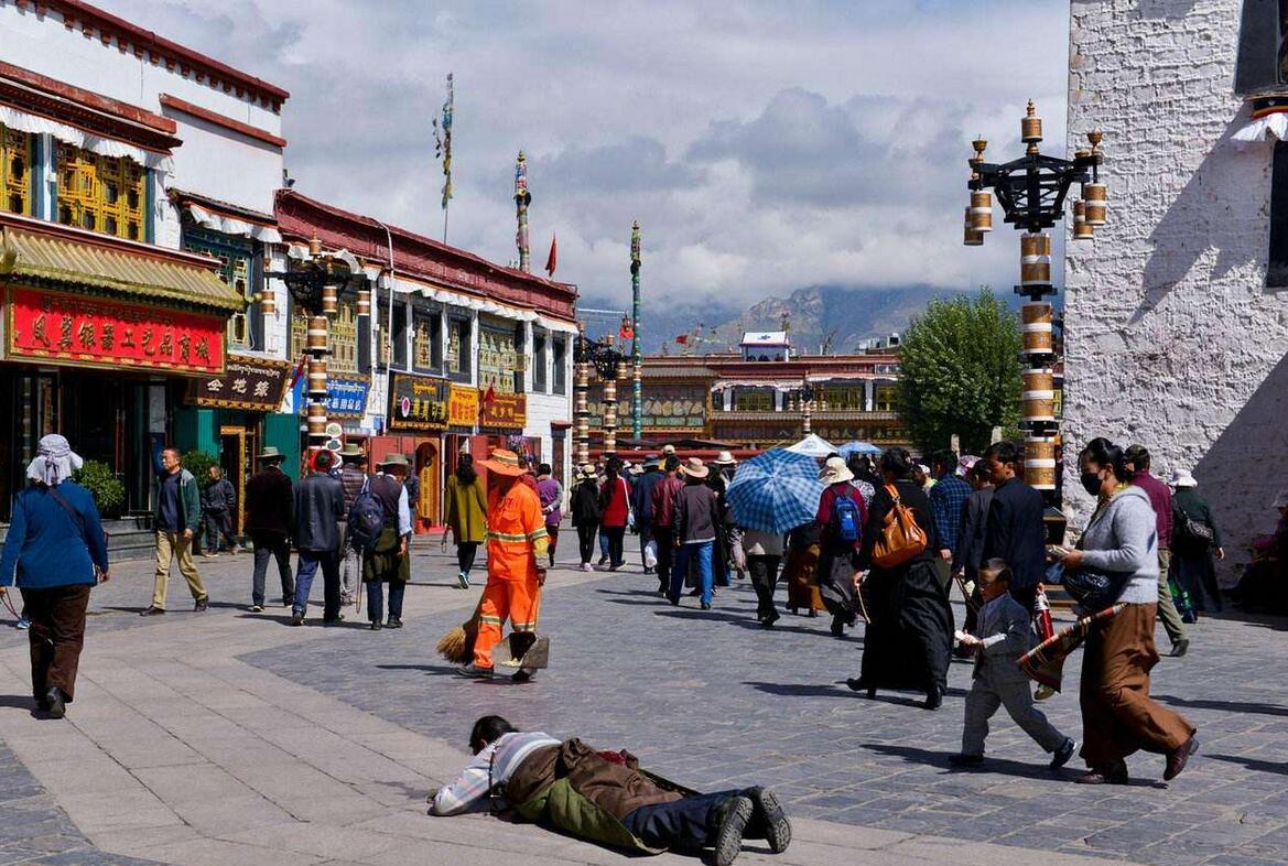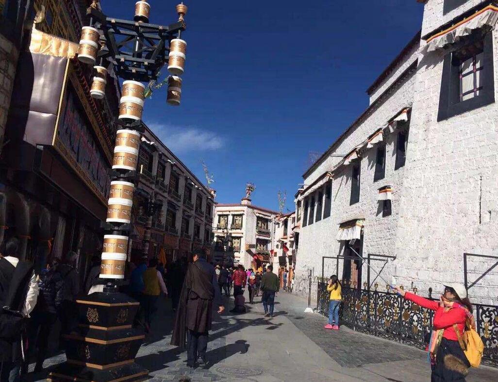 八廓街又称八角街。据说,是这里的四川人把"廓"念成"角"演绎而来。后来,有人望文生义,以讹传讹,以为八角街,是因为环形街道有八个角而得来。 八廓街是拉萨目前最繁华的商业街,也是中国十大历史文化名街之一。以大昭寺为核心的宗教场所是八廓街运转的轴心。八廓街,又称八角街,是一整片具有浓郁藏族生活气息的街区。街上商铺林立,包罗万象,宗教与市井气息交融,信徒与游客错杂。混乱,但生机勃勃。 行走在拉萨街头,能感受到有过诗人的存在,而不仅仅是高高在上的佛王。那应该是一个诗意的街道,应该有美丽传说的爱情。 说到八廓街,必要说转经。在拉萨,据说共有三条转经道,分别是三条环形路线。内环就在大昭寺里,称为朗阔,围绕释迦牟尼佛殿转经;中环即是八廓街,围绕整个大昭寺转经;外环的起点和终点都在布达拉宫背后的龙王潭,围绕整个拉萨城诵经。而这三条转经路,八廓街最为繁荣。 八廓街内,街道两旁店铺林立。在这里从事经营的,有本地人,但大多是外来者。其售品五花八门,但万变不离其“经”。开经铜佛、转经筒、酥油灯、经幡旗、经文、念珠、贡香、松柏枝等宗教用品,每店不离,并占在突出的位置上。西藏的土特产,成为对外地人的叫卖。此外,印度、尼泊尔、缅甸、克什米尔等地的商品,也纷纷在这里抢滩。 西藏,你有什么魔力,让那么多人匍匐在你的脚下,沉醉在你的梦里。而我只是千万人中的一个,渺小的几乎可以省略。 在藏民族的心目中,松赞干布和文成公主,是菩萨变成了国王和王后后,教化藏民族的救世主。因此,在大昭寺,有一个专设的松赞干布殿。人们从艺术的角度,对松赞干布与文成公主进行了再造。松赞干布面貌端庄,以一位正派人物的肖像赋予了他。而文成公主,则发髻高挽,是典型的大唐女子形像。从人们对雕像的刻画与塑造中,可以看出对松赞干布与文成公主的重敬。 每到一个地方,最好的体验就是深入当地的民俗风情。比起秀丽的景色,我更钟情于当地的风土人情,人们最真挚的热情、善良和淳朴引发的才是最美好的感动。 八廓北街,是围绕大昭寺专设的转经道。从而完整地再现了古城的风貌和居住方式。它以活的素材,为研究藏文化与中国历史,提供了一份宝贵的见证。 转经的信徒、旅游的人、休闲的人共同汇成顺时针方向的人流,身在其中热情澎湃。不时看到全身着地磕长头的信徒,其虔诚的态度,让你感动。西藏也是一个世俗的地方 ,八廓街紧挨着寺院,却坦然地洋溢着世俗的快乐,似乎每天都一样从未有过中断。转经的转经、游荡的游荡,买卖的买卖。磕长头的信徒饱受风霜的身体扑倒在大地的沉重声音令人怦然心动,却并不妨碍一队又一队花枝招展的旅行者嬉笑而过;尽管有雄伟壮丽的布达拉宫是如此显赫华丽,玛吉阿米那土黄的墙壁与床铺也一样值得怀念。 只要你到西藏,即使你没有任何购物的心理,当你游罢大昭寺之余,面对如此繁华的街市,走在摆满了玲珑满目工艺品的充满藏式气息的街道上,你无疑地会想到给万里之外的家人、朋友带上点什么,不论东西的价值几何,都会让你的家人或朋友感激不已的,因为你没有忘记他们! ; H- s9 k1 [' \