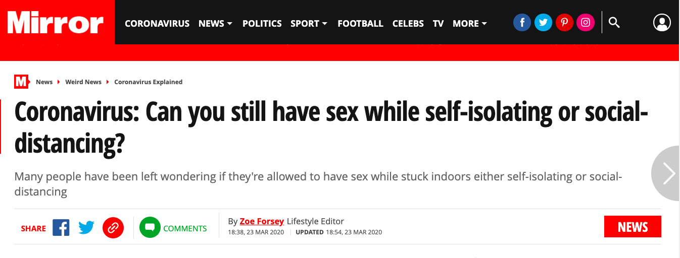 十个月之后,我们或许会迎来一个生育高峰期?好,我们来探讨一些成年人的问题,居家(隔离)期间,如何安全进行性生活?这里的安全,我们指的是不要传播新冠病毒。 加拿大康考迪亚大学(Concordia University)行为神经学博士Gonzalo R. Quintana Zunino近日在新闻网站The Conversation上撰文,对这一问题进行了解答。英国东安格利亚大学传染病学教授Paul Hunter也在《镜报》上分享了他的看法。 Gonzalo R. Quintana Zunino指出,目前没有可靠的研究、官方信息或可信的机构,科学的报告新冠病毒是否会通过性传播。接吻等举动容易导致人们从被感染的伴侣处感染病毒,但这并不属于性传播途径。 鉴于新冠病毒会通过呼吸道飞沫和密切接触传播,结合性生活时会有接吻、身体触摸等行为,与感染者发生性行为而感染病毒的可能性几乎是确定的。Gonzalo R. Quintana Zunino说,由于这种病毒存在于呼吸道分泌物中,我们很容易理解,几乎任何性行为都会因密切接触而造成新冠病毒传播。 法式接吻不在考虑之列。Hunter教授表示,“如果能想出一种没有法式接吻的性爱方式,那可能是个不错的主意。” 那么,居家隔离不能有性生活吗?这是一个糟糕的提问! 对于这个问题,Gonzalo R. Quintana Zunino和Hunter教授的看法较为一致:如果你和你的伴侣没有被感染、没有任何症状,且一直呆在家里,那么性生活可能不会带来风险。 不仅如此,Hunter教授还认为,新冠病毒的大流行将给明年带来一个生育高峰。“我相信明年的初出生率会上升”。 但对于需要自我隔离的人(已经出现症状的人、与出现症状的人同住或从感染区回来的人),Hunter教授建议,应该尽可能的和其他人保持距离。如果夫妻二人中有一个病了,最好在七天时间内避免性生活。 在Gonzalo R. Quintana Zunino看来,在目前情况下,“性”虽然不是讨论的重点,但错误的信息很容易滋生。如果不采取必要的预防措施,人们可能会不知不觉的加剧病毒的传播。为此,他总结了性生活过程中,有助于降低新冠病毒传播风险的若干建议。 什么是新冠时期安全的性行为? 首先,性行为之前请洗手!用肥皂和温水彻底洗手至少20秒钟,把它当成隔离时代的新前戏吧。 需要戴口罩吗?想想画面就很感人。如果你认为你需要一个面罩,很可能你并不需要。世卫组织建议仅在特定情况下使用口罩。有证据表明,日本的一些女性在不化妆的时候会戴上口罩来增加自己的吸引力。然而,也有研究表明,对一些人来说,口罩会降低脸的吸引力。 没有证据证明戴着口罩接吻是安全的。 需要戴套吗?使用套、牙套或乳胶手套可进一步降低传染风险。这些可能不是你喜欢的,但是在非常时期需要这些方法。 什么是非常规亲密举动? 任何形式的性交都有风险,尤其是当没有疫苗或药物来治疗或预防这种疾病的时候。 每个人都喜欢得不到的东西。停止或放弃你最喜欢的动作,或许可以减少风险,只会让性爱在最后变得更加甜蜜。 与性相关的行为有很多种变化。可以尝试用按摩、聊天、看看性爱视频等代替亲吻和性生活。 与爱人增加沟通更幸福 与伴侣的想法保持一致很重要,特别是在你感到不舒服或不想发生性行为时。对于单身人士来说,这绝对不是约会的最佳时机,也不要让自己暴露在新伴侣带来的风险中。 如果他真的喜欢你,他会等待,如果你已经开始与其交往,记录好何时何地你们在一起过。 随时了解疫情变化 新冠病毒可不是闹着玩的,它已经夺去了世界各地成千上万人的生命。我们可以通过自己的方式,为阻止病毒传播努力。 阅读可靠的信息,不要惊慌,呆在家里。Gonzalo R. Quintana Zunino表示,通过各国政府、科学家和人们的共同努力,保持耐心,我们将战胜这一切,回归正常生活。到那时,我们也许就能恢复正常性生活了。 & B3 ~ y2 v7 } Z3 F$ A0 [
