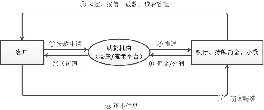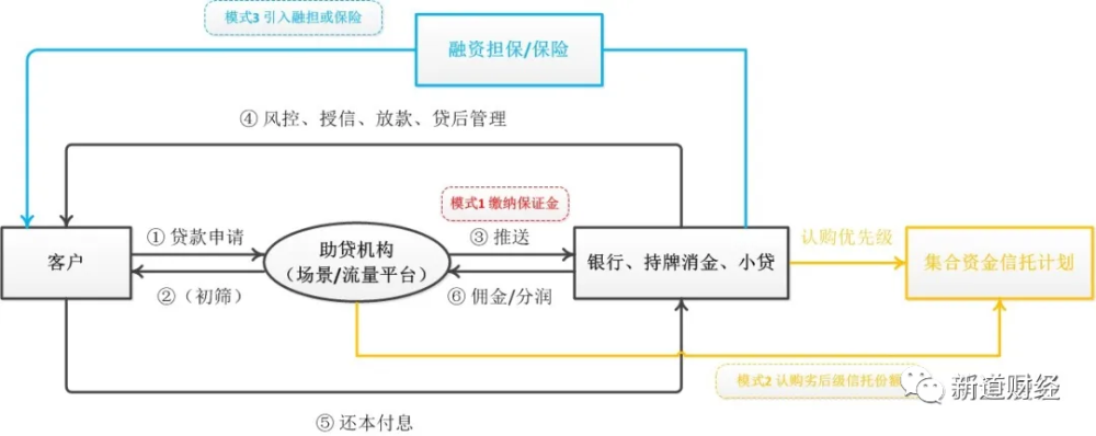 $ n7 S! W! A0 g4 b6 Q8 k纵观消费金融战场,助贷业务存续发展多年,依然是互金机构、持牌消金、银行等冲高零售增量的利刃。 究其原因,在于中国零售业借助互联网平台迅速崛起,消费升级,短时间内积累庞大零售客群。经济下行压力凸显,银行资产配置向零售端倾斜。 同样借助互联网、大数据等技术手段,消费金融行业出现持牌消金、互金机构、P2P等新业态,将金融工具以更加隐形、高效的手法嵌入消费场景。 据财新报道,截至2019年9月,助贷、联合贷市场规模已经达2万亿以上,涉及数百家银行等金融机构。其中,蚂蚁金服超过1万亿,平安普惠3000-4000亿,微众银行约2500亿,三家合计占市场90%。其余市场份额被京东数科、百度系、民营银行、持牌消金瓜分。 如果以泛消费金融口径测算,剔除房贷、车贷、信用卡,光大证券研究报告显示个人消费金融市场已经达5万亿规模。如果将信用卡业务算在内,市场规模约为13万亿。 重金之下,必有勇夫。众多金融机构在助贷业务标准版本上,根据自身情况拆解重构、优化组合、创新再造,迭代出的子模式层出不穷。 助贷业务模式的子类有哪些?主要玩家的类别和规模?何种资产受到资金方青睐?增信模式如何助推助贷?增信模式的风险和隐患?助贷未来前景几何? 下文将围绕以上问题,从实际操作角度给予拆解剖析。 助贷业务 萌芽起源 深圳,作为改革开放的前沿阵地,总能孕育出新萌芽。 2008年,深圳市中安信业与国开行深圳分行、建设银行深圳分行共同创新出“助贷机构+贷款银行”的微贷业务模式,被认为是助贷业务的起源。 业务流程 助贷业务广义上的理解是:助贷机构与金融机构合作,实现对客户的贷款投放。 标准版的助贷业务流程如下: 标准版基础上,银行、持牌消金等金融机构为了锁定风险和收益,主要围绕增信措施衍化出许多高阶版本。 机构与模式 助贷机构主要分为垂直类与聚合类两类,后一类又分为开放平台、贷款超市与金融科技机构。 垂直类助贷机构指提供某一垂类商品或服务的电商或服务平台,将自身消费场景与外部金融机构联通,为银行、持牌消金、互金公司等提供客户流量,例如携程、懂球帝。 聚合类助贷机构指专门从事流量收集、筛选与分销的机构平台。 开放平台主要指自身持有消金或小贷放款资质,在满足自身对线上客户需要同时,向外疏导流量的机构,通常模式为 C&B to B to C&B,例如马上消金、维信金科。 贷款超市主要指本身无放贷资质,通过搭建获客平台渠道获客,联通资金机构,表现形式有网站、APP、论坛等,通常模式为 C to B to B,例如融360、贷超联盟。 金融科技机构主要指本身无放贷资质,通过搭建技术平台、连接众多垂直类机构获取流量,通过技术手段对流量进行筛选重组,再输出给金融机构的业务形式,通常模式为B to B to B,例如品钛,同盾。 联合贷 站在流量与资金匹配的视角上,联合贷(贷款联营)实际上是助贷业务一种复杂高阶版本。对合作方的资质要求更高、业务模式也出现实质性的进化,已然成为另外的一个精彩故事,日后有文独立呈现。 法无定法,万法归宗。无论助贷、联合贷,业务类型的定义、边界经常发生变化,且玩家也在不同的业务模式间根据需要不断切换。所以,不必纠葛定义,只要内化核心、融会贯通,就能事半功倍、行者无疆。 收费结算 市场主流的收费模式: 资金方收取全部费用,再将服务费或者利息返还给助贷机构或增信机构。 资金方收取利息费用,助贷机构或增信机构收取非利息费用。 市场主流的结算方式: 1.CPS模式:按照贷款本金固定比例。 2.分润模式:按照IRR利息分成,可按照阶梯区间定价。 热门资产 在《商业银行互联网贷款管理暂行办法》(征求意见稿)流出后,单笔金额10万以下,期限12月内,强场景、受托支付、风险可控的资产受到银行、持牌消金的特别青睐。 风险提示 在2019年下发的《关于网络借贷信息中介机构转型为小额贷款公司试点的指导意见》中,明确了P2P平台转型的两条路径:消费金融公司、网络小贷公司,没有提及助贷。 未来助贷的走向有可能和P2P网贷行业一样,需要备案甚至持有资质,只是短期内可能性较小。 发展前景 存在即合理,助贷业务目前完美匹配流量方与资金机构的业务诉求。 在银行、消费金融、小贷等金融机构未能完全健全自营渠道与独立风控能力、打通任督二脉之前,助贷业务将继续扮演连接资金资产的角色。 且随金融科技与P2P平台的转型,未来助贷资产可提供的消费场景和资产类别将更加丰富。只是随着竞争加剧,技术手段增强,助贷头部聚集效应更加明显。 掌握客户,议价能力水涨船高,放贷机构利差压缩,挑战从来伴随增长。 增信模式 高喊拥抱变化,却时刻畏惧风险,这是金融机构的常态。 2019年1月和4月,浙江银保监局与北京市互联网金融行业协会分别下发《关于加强互联网助贷和联合贷款风险防控监管提示的函》、《关于助贷机构加强业务规范和风险防控的提示》,要求商业银行、持牌消金、小贷等在助贷业务中“不得接受无担保资质的第三方机构提供增信服务以及兜底承诺等变相增信服务”。 有意栽花花不开,无心插柳柳成荫。上述文件反倒成为助贷业务增信模式的少有的明确政策依据。 助贷业务增信模式主流分为:1.保证金模式。2.信托分级模式。3.融担/保险模式。 保证金模式: 助贷机构向放贷资金方缴存一定
