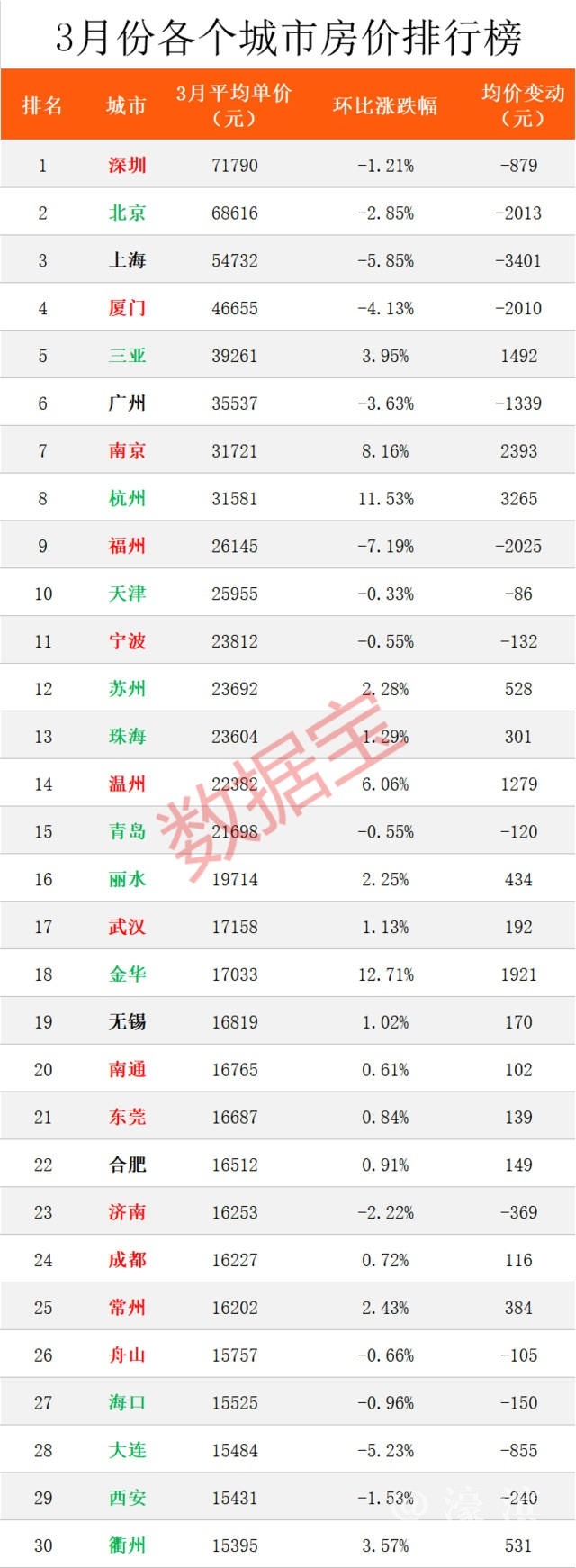 [新闻快讯] 三月份全国各城市房价排行榜 |