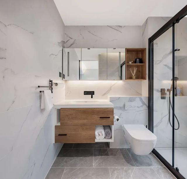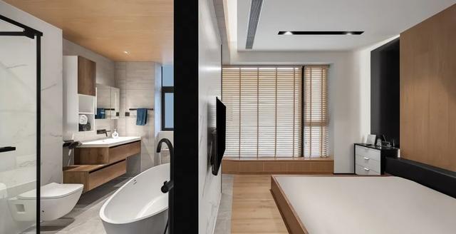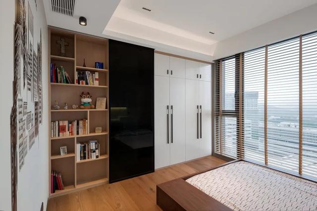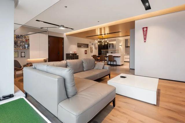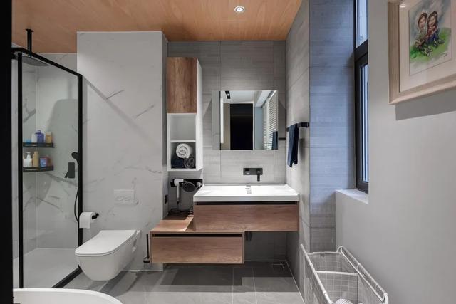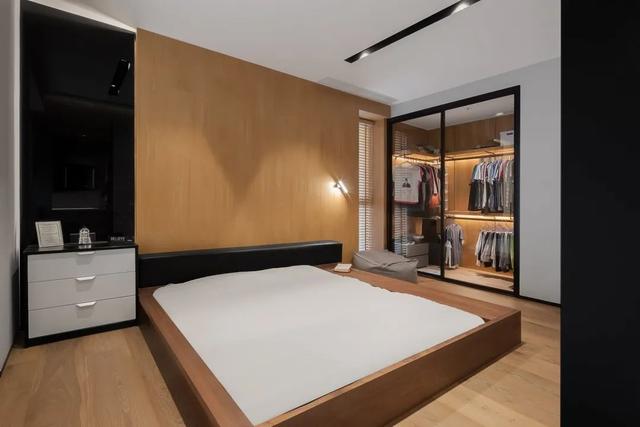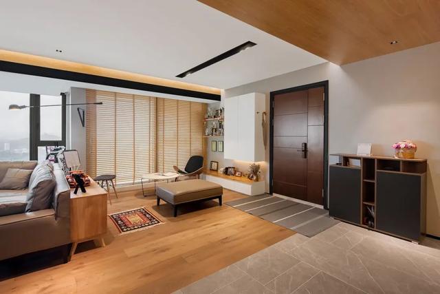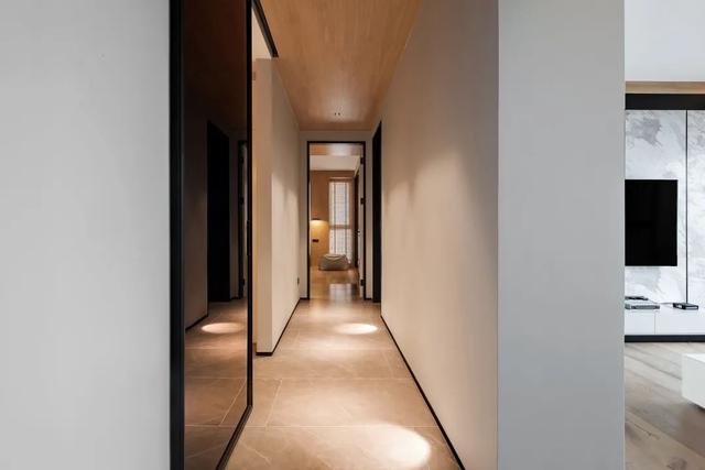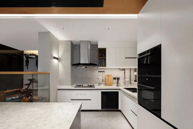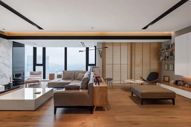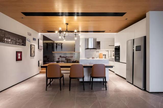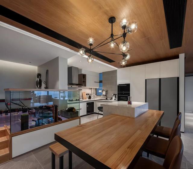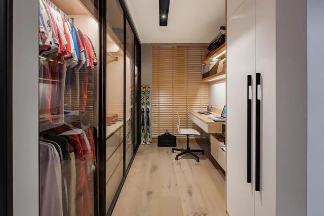 这是一套非常温馨的现代简约风格装修案例,在现代大方的空间基础,室内加入大面积的木质感,搭配上现代舒适的家居软装,营造出一种舒适自然的端庄与大方空间感,给人以暖暖舒心的氛围。 客厅 ▲客厅空间现代舒适的简约氛围,在浓厚的木质感地面与天花装饰下,电视墙以大理石质感的设计,布置上暖灰色的皮沙发,让空间显得舒适而又温馨优雅。 ▲横厅户型的空间,客厅有着明亮舒适的采光与视线,让生活显得更加惬意从容而自然。 ▲木质感的地面基础,天花吊平顶的设计,布置灰色皮沙发+白色大茶几,让空间显得格外的雅致舒适。 休闲区 ▲沙发后方就是休闲区,摆上休闲椅与皮质的大皮凳,营造出一种轻松自然的休闲空间。 餐厅 ▲餐厅天花整体都是木质的设计,地面是灰色质感的地砖,布置上木质与大理石质感的中台岛结合,使得用餐空间也充满自然舒适的档次感。 ▲木质餐台与木质天花,使得用餐空间充满自然温馨的优雅气息。 厨房 ▲厨房空间以开放式的设计,白色的定制橱柜以L形操作台+嵌入电器的组合设计,让空间显得充满时尚大气的空间气息。 健身区 ▲在餐厨空间旁边,还有一个独立的健身区,以玻璃矮墙隔开,为主人提供了一个动感自然的在家健身运动空间。 走廊 ▲走廊的天花也是以木色的基础,两侧简洁的墙面空间,以层次温馨的灯光布置下,让空间显得明亮而又自然大方。 卧室 ▲卧室床头墙以茶镜玻璃+木质背景的空间,衣柜也是以玻璃门的设计,用卧室显得现代时尚而又实用大方,床垫嵌入到床体里面的床铺设计,整体空间也是显得更加和谐舒适自然。 主卫 ▲主卫与卧室一墙之隔,玻璃推门推开后,两个空间显得格外的通透。 ▲主人卫生间内部有着一个成品浴缸,为主人在家提供了享受放松的私密空间。 ▲淋浴房、马桶与洗手盆,一字排开的格局,黑白灰的空间基础加入木质感,显得简约现代而又时尚高端。 衣帽间 ▲衣帽间在玻璃衣柜的基础,设置了一张书桌,成为主人衣物收纳与办公加班的舒适安静小空间。 次卧 ▲次卧空间在简洁的空间基础,房门的那面墙上有着一幅城市建筑风的黑白墙绘,让空间显得更加时尚端庄。 ▲床尾位置衣柜+书架结合的收纳,保持空间简洁的同时又带来了实用的功能。 客卫 ▲客卫也是以雅白的墙面空间,搭配灰色的地砖,洗手盆柜实用收纳设计,带来的是一种简洁优雅的干净与舒适。 6 c) u# F! |5 p
