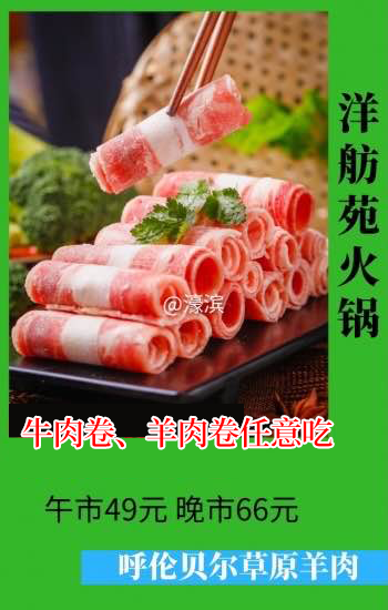 - |) ^2 l/ b1 w+ R: o每人每位指定两款呼伦贝尔牛肉卷、羊肉卷任意吃 2 q9 Y7 Z- i$ g: p/ q) t