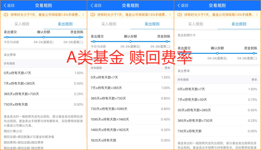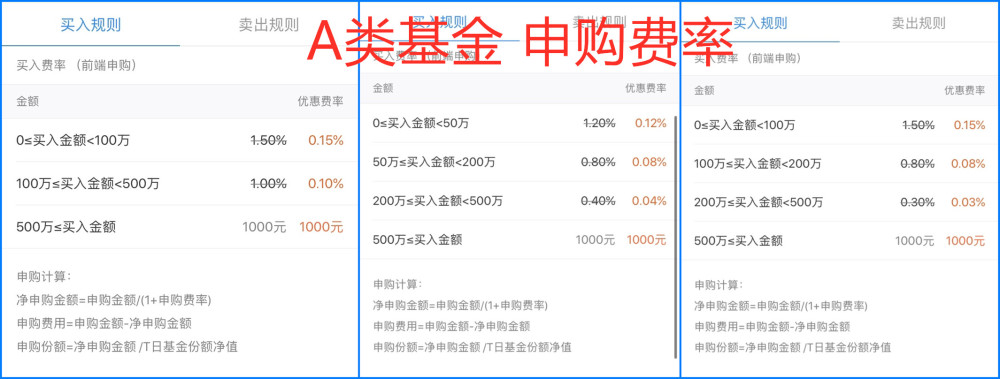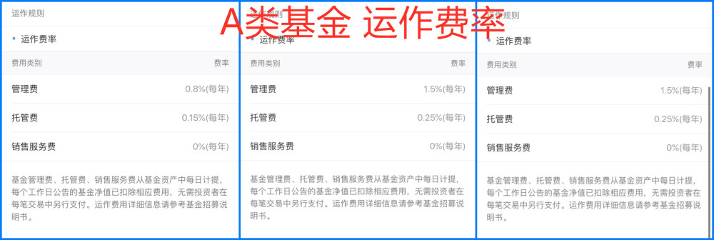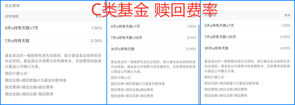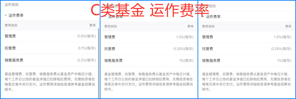 机构在基金发行前,需要给基金起名起代码,各种各样的基金名称,为的就是能让投资者更好的从基金名称中了解到这只基金包含的概念,而有的基金名称尾巴带有A/C字母,这也是机构给基金的一种标注。那么、A类基金和C类基金有哪些不同之处呢? 我们一起来看看 一、A类基金 1、申购费率 我截取了几只来自不同机构的A类基金,从申购费率方面来看,一般的申购费率为1.5%,但是大部分基金都设有优惠费率,以截图中这3只基金的申购费率为例,前后这两只100万以内申购费率为1.5%、中间这只基金50万以内申购费率为0.12%。基本上是以投入的资金量大小决定费率,投入的资金量越大费率就越低。 2、赎回费率 赎回费率这块,持有时间小于7天,赎回费率为1.5%、持有时间大于7天0.5%,若持有的时间越长,费率也会越来越低,比如截图中前后这两只基金,持有时间730天(2年)赎回可免手续费。中间这只基金持有时间需要超过1826天(6年)才能免赎回费用。 3、运作费率 运作费也是不尽相同的,第一只基金管理年费率为0.8%、托管费0.15%;共计年费率0.95%。第二和第三只基金管理年费率为1.5%,托管年费率为0.25%。共计年费率为1.75%。 二、C类基金 1、申购费率 C类基金是免申购费率的,不管是混合型C类,指数型C类,或是债券型C类,申购均是0费率。 2、赎回费率 C类基金的赎回费率会比较低,一般情况下,只要持有时间大于7天,费率就会大大减少,或全免。从截图中可以看到,第一只基金持有时间超过7天赎回0手续费,第二和第三只基金持有时间超过30天,赎回则可免手续费。 3、运作费率 运作费相同也有不相同,第一只基金管理年费率为0.5%、托管费0.1%,销售服务费0.2%;共计年费率为0.8%。第二和第三只基金管理年费率为1.5%,托管年费率为0.25%,销售服务费1%,共计年费率为2.75%。 三、那么、A/C类基金,投资哪种更划算? 从以上罗列的三种不同费用来看; A类基金需要申购费,想要获得赎回费率,持有时间至少要在2年以上。 C类0申购费,持有时间大于30天以上,赎回可以免赎回费率。 在服务费率方面,A类相对较低一些,C类略高。 如果是打算长线投资持有,比如计划定投个三个年以上,那么可以选择A类基金,虽然前端收费,但是只要持有时间有个3年以上,很多基金赎回也是0费率的,A类更市场长线投资。 假如是喜欢追热点题材,短线操作交易者,那么可以选择C类,0申购费率,持有7天免赎回费率,就比较适合短线投资者。 因此,A类基金和C类基金哪种更划算,首先要看你的投资策略是什么,具体要根据自己的投资策略来选择,才能知道哪种才是更划算的投资方式。