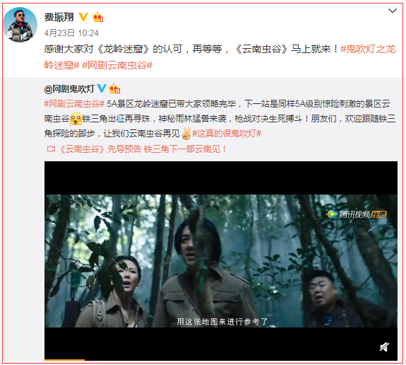 经过二十多天的倍伴,潘粤明版的《龙岭迷窟》在网友依依不舍中迎来收官。而曾经执导上一部《鬼吹灯之黄皮子坟》被网友大骂的导演费振翔也凭此剧成功翻身,网友们迫切地想了解,下一部《鬼吹灯》系列作品是否还是由潘粤明、张雨绮和姜超摸金铁三角组成?将何时搬上荧屏? 4月23日,导演费振翔在转发《网剧鬼吹灯》官微视频时,表示:感谢大家对《龙岭迷窟》的认可,再等等,《云南虫谷》马上就来! 从《网剧鬼吹灯》官微放出的视频花絮可以看出,基本上跟《龙岭迷窟》大结局片尾的彩蛋一样,下一站目的地古滇国献王墓探险是在惊险刺激的云南虫谷景区,由潘粤明、张雨绮和姜超组成的摸金铁三角再度出征寻找雮尘珠。跟《龙岭迷窟》相比,探险之旅从地下迷窟转移到地上热带雨林,而神秘雨林中各种超级猛兽来袭,很明显摸金校尉们的装备也是有所升级,一场枪战对决生死搏斗一触即发! 不过,网友们也是好奇,在《龙岭迷窟》中摸金三人组可都是乖宝宝,连红缨枪都没有带就下窟了,幸亏有龙岭十子一伙,弥补了装备不足的缺陷,否则分分钟就喂了人面蜘蛛。不知道在《云南虫谷》剧中,摸金铁三角是如何合理合法地搞到“大杀器”,直捣献王墓。 据悉,《云南虫谷》的拍摄工作早在去年就已经进行了,后来由于特殊时期剧组停工了,不过,随着情况的好转,现在已经进入正常的拍摄。网友们比较关心的是《云南虫谷》该如何拍,才能把虫谷中的人,霍氏不死虫、夫妻树、闪婆、下蛊等等这些合理又科学地呈现出来,这个可能比较困难,就看编剧怎么办了。 从视频花絮中稍微可以看出,《云南虫谷》基本上又要给群演加戏了。当然,如果又是碰上龙岭十子以及马大胆这样的“宝藏男孩”也无所谓,给他们加戏不仅可以解决主角们缺少装备的难题,也顺便解决“盗墓”的道德窘境的同时,还能插科打诨,制造一些笑料,略微缓解一下倒斗的紧张气氛,文武之道,一张一弛嘛。 我觉得《龙岭迷窟》完美收官跟导演费振翔坚持用拍电影的方式拍网剧的精细风格分不开的,当然也离不开潘粤明等一众主创的精彩表演。希望在接下来的《云南虫谷》中,潘粤明、姜超、张雨绮摸金三人组能带来更多的惊喜给大家。 ( N) O# F* f0 Q" S% A