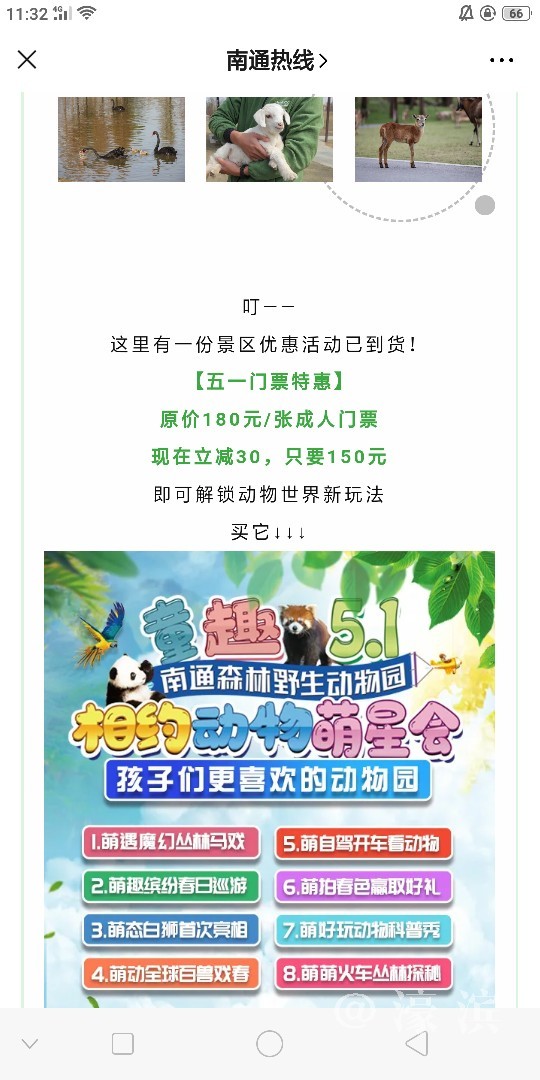 [随便港港] 南通森林野生动物园五一假期优惠!原价180,现价150 |