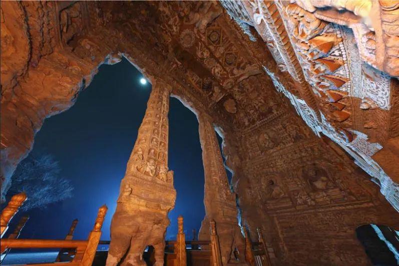 你一定听说过它 虽然可能从未谋面 故事开始于一千多年前 以刀、锤、斧、凿的尖利 决然抚平山崖的棱角 在“叮叮当当”的回响中 岩石的粗砺被驯服 曾经的坚硬顽固 就那么自然而又神奇地 化作了一片法相庄严 云冈石窟五华洞前石柱。山西省文化和旅游厅 供图 王朝兴衰、时代变迁、文化交融 …… 一个个错落的窟龛中 藏着许多人的 许多故事 它 是 云冈石窟 雕凿