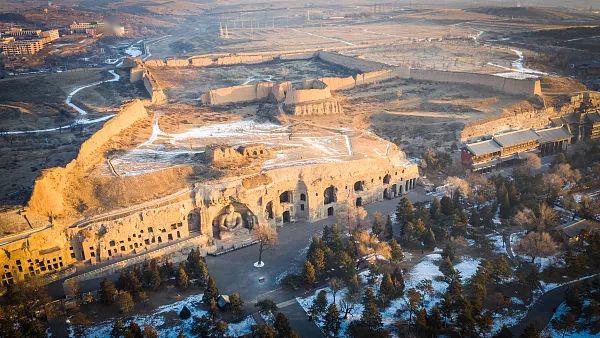 武州川水又东南流,水侧有石,祗洹舍并诸窟室,比丘尼所居也。其水又东转迳灵岩南,凿石开山,因岩结构,真容巨壮,世法所稀,山堂水殿,烟寺相望,林渊锦镜,缀目新眺。 ——北魏·郦道元《水经注》 山西省大同市城西约16公里 悠悠流淌的武州川水 见过很多人的身影行过 然而有一段见证 与众不同 云冈石窟景区内秋色美不胜收。新华社记者 范敏达 摄 那是在距今1500余年的北魏年间 这里是王朝的都城——平城 伫立于岸边的 是高僧昙曜 瘦劲骨骼,袈裟飘逸 他那时大约不知道 自己的执着与诚心 最终会演化成 东西绵延约一公里的蔚然大观 —— 正是他 “凿山石壁,开窟五所,镌建佛像各一” 揭开了云冈石窟开凿的序幕 从北魏文成帝复法启开凿之始 到北魏正光年间终结 营造这片盛景 大致历经了 近70年之久 而如今 透过 45个主要洞窟、209个附属洞窟 1100多个佛龛、18000余平方米雕刻面积 我们依然能够感受到 扑面而来的恢弘雄浑 大同云冈石窟景区一座洞窟内的石刻佛像头部。新华社记者王颂摄 盛大之外,别有匠心 大大小小的造像 最高者17米 最小者仅2厘米 万千雕凿费尽工夫 刻划出的 是历史的模样 融汇