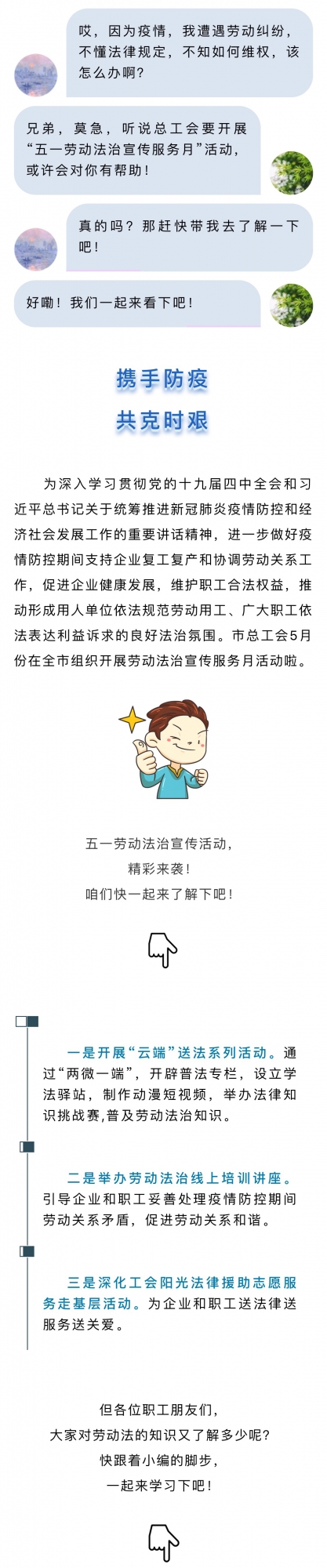 职工朋友们,快参与到本次活动中来吧!我们一起尊法守法学法用法,自觉维护法治的权威和尊严,依法理性有序处理劳动关系矛盾,促进企业复工复产和劳动关系和谐稳定。