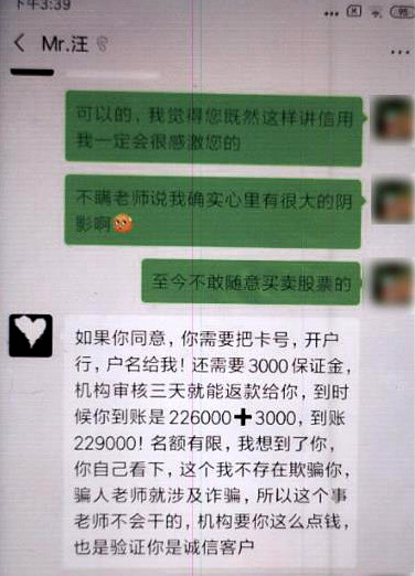 近年来,贷款诈骗、购物退款诈骗、刷单诈骗屡见不鲜,但你是否听过“财经老师”帮股民申请炒股亏损补贴? 近日,上海市公安局宝山分局祁连派出所就破获了一起电信网络诈骗案件,假冒财经老师声称为股民申请亏损补贴,实则骗取保证金,涉案金额146万元。 图说:汪某与何女士微信对话截屏。宝山公安分局供图 2018年2月,何女士在手机下载APP软件炒股,在APP的财经直播间内认识了所谓“财经老师”汪某。何女士加汪某微信好友后,根据他的推荐购买股票,至2018年4月底,累计亏损了37万余元。 2019年8月,汪某主动联系何女士,自称就职于某投资基金管理公司,该公司规模大、发展成熟,可以为客户提供投资亏损补偿服务,客户可以以名下的银行储蓄卡向公司提出补偿申请,每张银行卡最高可申请85万元的投资亏损补偿。客户提出补偿申请的,需先交申请补偿30%的保证金,且交得越多,补偿审批速度越快。不仅如此,汪某还蛊惑何女士放弃炒股,将炒股的钱用于申请公司补偿来赚钱。 图说:嫌疑人汪某(中)。宝山公安分局供图 何女士信以为真,在接下来的4个月里,陆续向汪某转账148万余元。其间,为了不让何女士产生怀疑,汪某还约何女士见面,当面写了欠条,并转账给她2万余元,谎称是公司已发的补贴。 由于迟迟未得到所谓的几十万元补贴款,何女士儿子到汪某提供的公司地址寻找汪某,发现该公司根本不存在,何女士这才意识到被骗。 5月11日,上海市公安局宝山分局祁连派出所在浦东将汪某抓获。经审讯,汪某对自己实施诈骗的行为供认不讳。目前,汪某因涉嫌诈骗罪被宝山公安分局依法刑事拘留。 警方提醒: 理财投资必须选择合法正规的平台,不要轻信所谓导师、专家和精英;不要贪图所谓高回报、低风险的投资收益,不能心存侥幸去投资;不要轻信所谓的“代办”人员,任何要求先交纳费用等涉及资金转账的都要提高警惕。