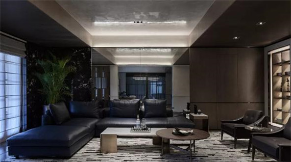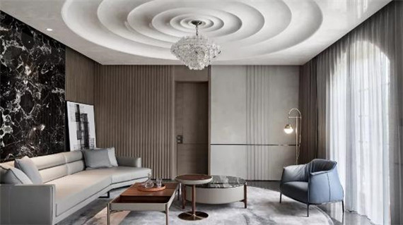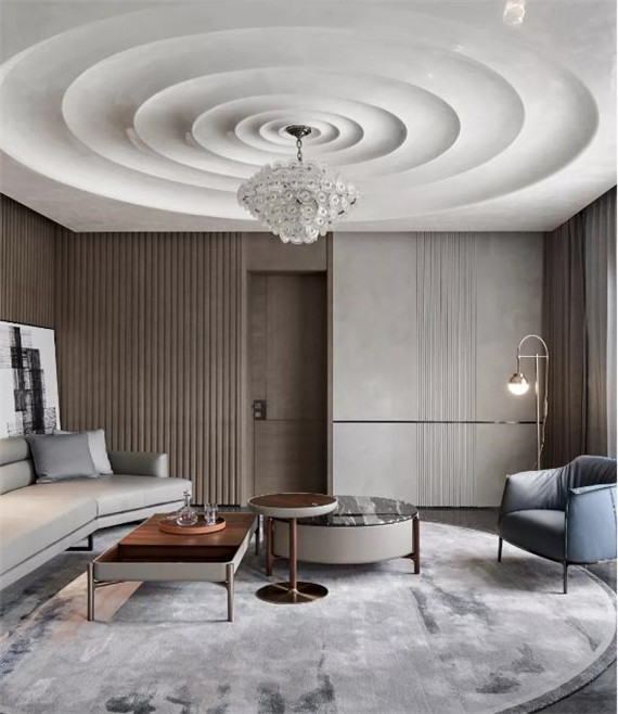 紧邻会客厅的,是悠闲舒怡的起居室。水滴涟漪般的吊顶让空间产生灵动的气息,永恒与美好在此波荡而开。地毯和茶几的几何形搭配平衡了空间,也使之层次更为多样,别具一格。