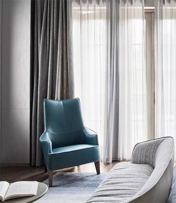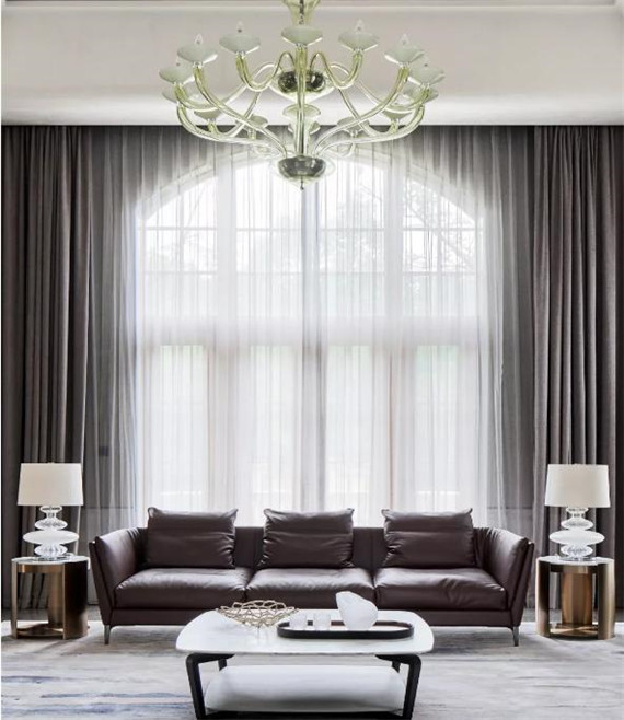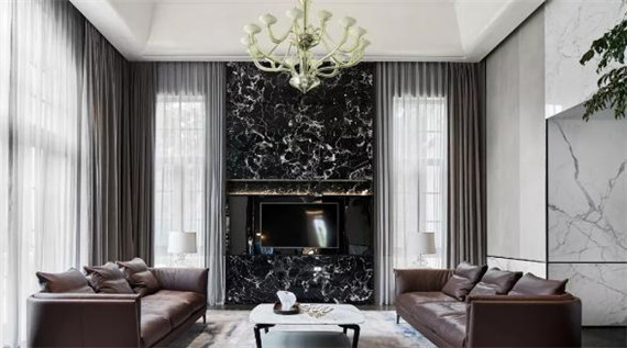 门厅正对着的是空间开阔、窗明几净的会客厅。沉稳的皮质沙发搭配质地清晰的大理石背景墙,地毯柔和的纹路综合了空间的刚硬,与淡绿色透明吊灯一起,为空间增添了几分活力。阳光透过柔纱窗帘轻拂在会客厅内,宾客与屋主得以细语交谈,宾主尽欢。