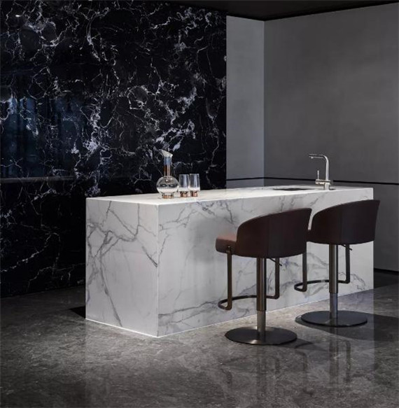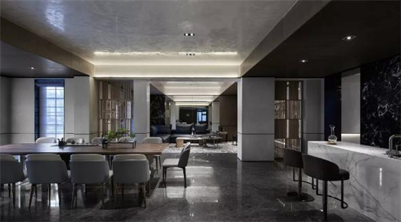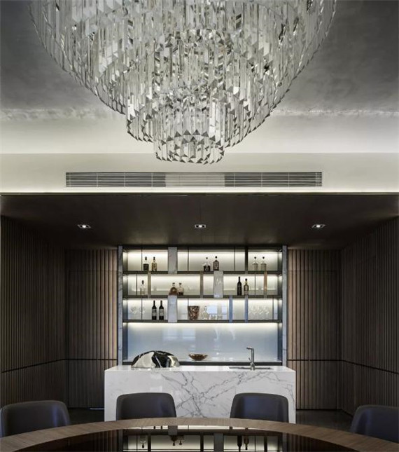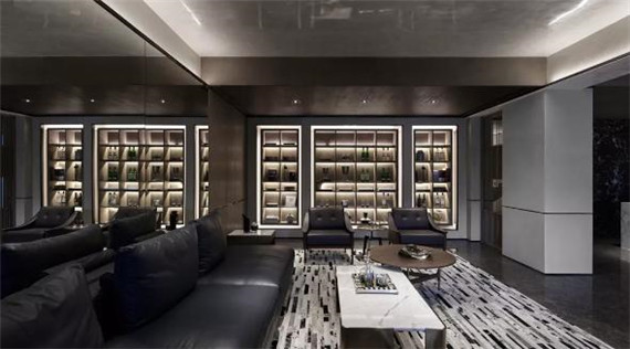 $ |0 ~" U6 f6 K% c) d走下楼梯,在地下层空间内,依旧以塞浦路斯灰大理石为地面主基调。在多功能活动区,一侧是亮白的酒吧台,另一侧则是木质长桌,可以满足家庭及好友相聚时的各种需求。 半开放式的红酒雪茄区采用大片落地镜面,延展了空间视觉。低调的黑色皮质沙发给人神秘而华贵的心理感受,精致的墙面展示柜为屋主留以足够的空间陈列酒品、雪茄及各类周边。