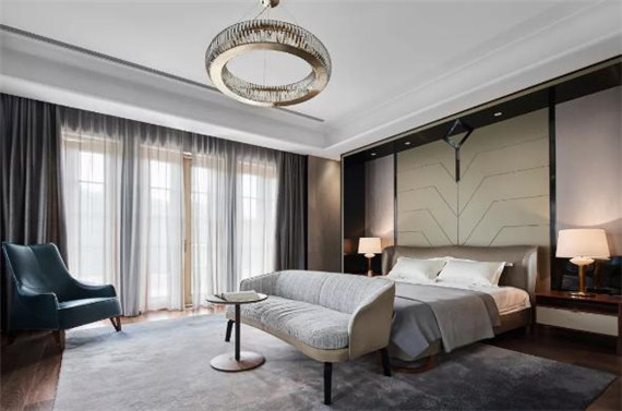 , [) H( r/ E" M3 @* B' {' f沿着楼梯上二层,这里是相对私密的卧室空间。 穿过楼梯间,主卧在楼层的一侧,色调柔和,质地讲究,不过于追求时尚,但隐藏的线条和肌理使人安逸。床头浅灰绿背景墙在空间中十分亮眼,与深色地毯产生了空间过渡,窗边精致的深色土耳其蓝单人皮质沙发,为主卧画龙点睛。正对床榻的抽象画,诠释着屋主不凡的品位。