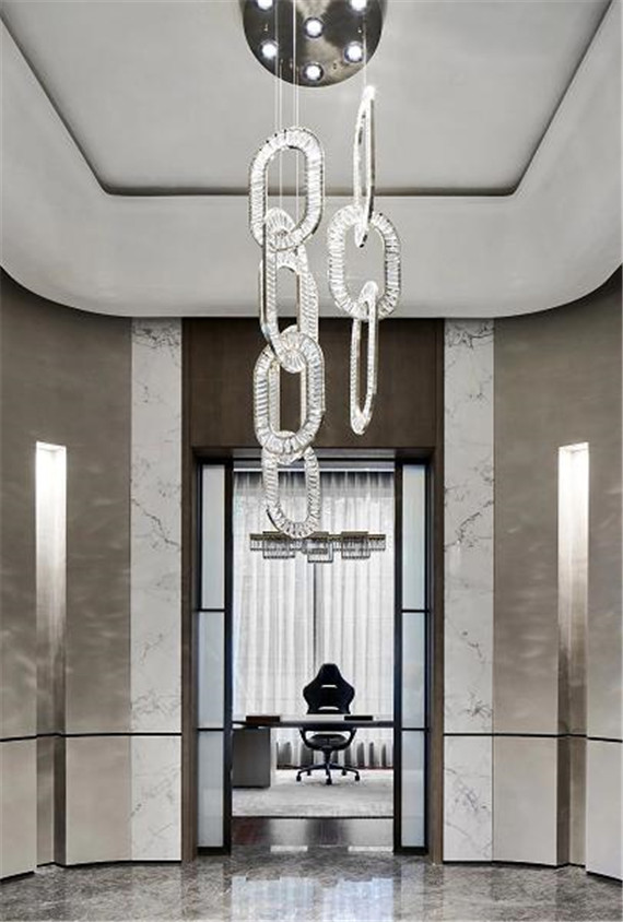 将艺术与人文情怀包融于空间中,从不同维度展现了屋主的生活格调,也为当代大坪数居家空间树立了模板。 落落大方的门厅以极简的金属质感为主调,“少则得,多则惑”的东方辩证哲思为内在气韵,使人进门便感受到优雅而大气的空间气场,设计感极强的吊灯赋予了门厅别样的几何线条,方圆之间,自由天地。