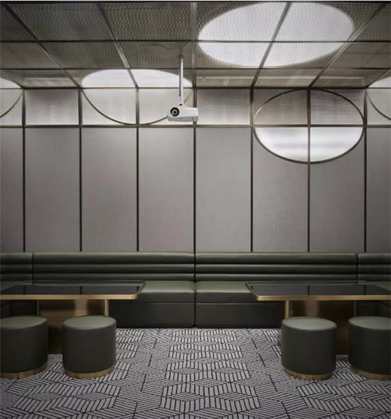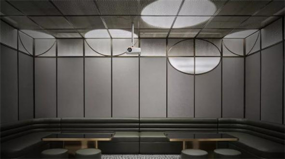 在地下层还设立了影音兼KTV室,灰色调墙面与墨绿色家具,使空间安宁,金色线条的加入,又增添了流动性与金属感,满足了家庭娱乐和好友聚会的多样性选择。  / o( V% x' Y* p. g