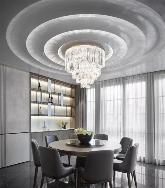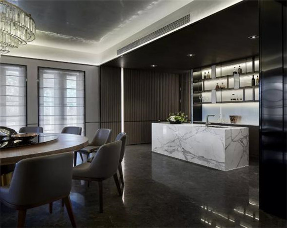 通过一扇拉门,进入餐厅。塞浦路斯灰大理石地面沉稳而时尚,一侧的调酒吧台彰显了屋主的格调,圆形餐桌符合中国人饮食习惯,吊顶与吊灯更是在用餐期间为圆满融洽的氛围述刻了形状。