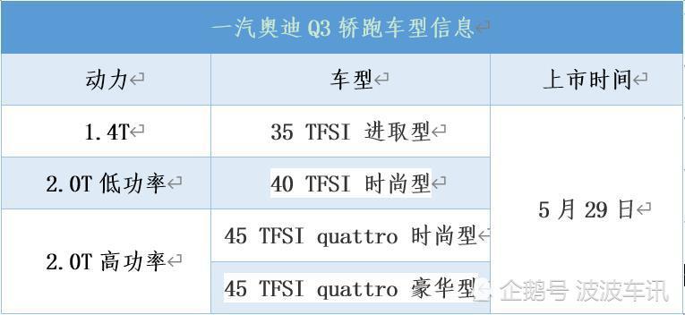 近日,我们了解到了即将上市的一汽奥迪Q3轿跑的配置信息,新车搭载了和奥迪Q3相同的三款动力信息,分别搭载1.4T发动机和2.0T高低功率发动机,新车将会在5月29日正式上市。 此次奥迪官方展示了4款车型的配置信息,其中1.4T车型和2.0T低功率车型各一款,2.0T高功率车型有两款车型,2.0T高功率车型都配备了奥迪的Quattro四驱系统。奥迪Q3轿跑搭载的1.4T发动机的最大输出功率为150马力,峰值扭矩为250牛·米;2.0T高低功率发动机的最大输出功率分别为220马力和186马力,峰值扭矩分别为350牛·米和320牛·米,全系车型采用的是7速双离合变速箱。 奥迪Q3轿跑配备了LED大灯、全景天窗、智能钥匙、真皮/Alcantar材质混搭座椅、前排电动座椅调节、三温区自动空调、自动防眩目后视镜、雨量传感器,高配车型还配备了大灯清洗、双色车身、后视镜电动折叠、矩阵式的LED大灯、车内氛围灯、前排座椅加热、平底式运动方向盘、B&O品牌音响、内置导航包的奥迪虚拟驾驶座舱,在配备方面的表现应该和奥迪Q3差不多。 奥迪Q3轿跑的外观比奥迪Q3表现得更有运动效果,它的前脸采用了很运动化的设计,新车的前进气格栅采用了多边形的造型,上面采用了很粗犷的蜂窝式的黑色网格装饰,还采用了点阵式的镀铬小元素进行点缀。新车的大灯造型很凌厉,它的前脸底部采用了运动化的包围,两侧的空气导流槽采用了灰色立体的装饰条连接。 奥迪Q3轿跑的侧面造型更具有运动效果,它采用了一个下沉式的车顶和溜背式的车身设计,新车的车顶采用了很细致的风格,后挡风玻璃的前倾幅度很大。它的侧面下半身的设计和奥迪Q3区别不大,前后翼子板的位置比较突出,车底部采用了黑色的包围覆盖。 奥迪Q3轿跑的车尾部的表现也非常的运动,它的后挡风玻璃的前倾幅度很大,配备了扰流板,尾灯和前大灯采用了呼应式的风格,新车的底部包围也表现出了很运动的效果,底部还采用了扩散器的设计,并采用隐藏式的排气。 奥迪Q3轿跑的内饰也很有科技感,它采用了三幅式的平底方向盘的设计,中控台上采用了贯穿式的金属质感的面板装饰,并且配备了液晶仪表盘,整体的内饰氛围也非常的运动。奥迪Q3轿跑未来的竞争对手为宝马X2,从外观上来看,奥迪Q3轿跑表现得更凌厉一些,它的运动效果更足,或许更受年轻消费者的青睐。