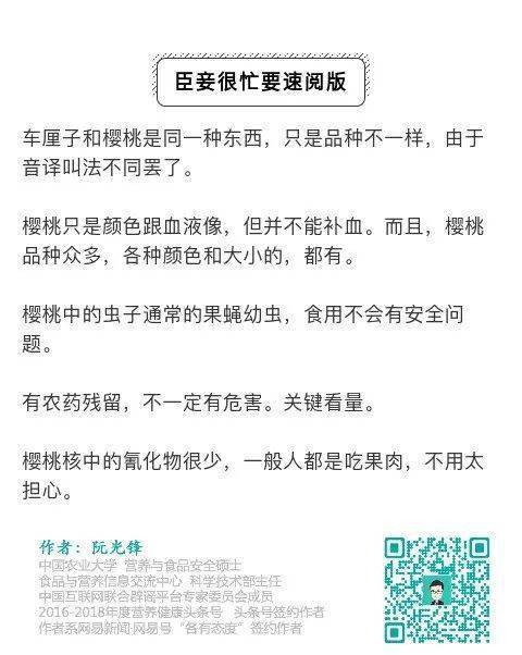 图片来源 freepik.com 又到了吃樱桃的季节,大家都吃了吧?由于好吃,吃起来还方便,我们家俩娃都挺喜欢吃樱桃的,最近也买了一些。 市场上的樱桃,有的叫「樱桃」,有的却叫「车厘子」,有的樱桃个头比较大,有的樱桃却很小巧,它们到底有什么不同呢?今天我们来聊聊吃樱桃那些问题。 01车厘子和樱桃,哪个营养好? 市场上的樱桃,有的叫「 樱桃」,有的却叫「 车厘子」。有人说,「樱桃」是国产的,「车厘子」是进口的。要买就买「车厘子」,「车厘子」不仅更好吃,营养也更好。到底是不是这样呢? 其实,「车厘子」和「樱桃」是一种东西。「车厘子」和「樱桃」都是蔷薇科落叶灌木果树,只是品种不同而已。 不同品种的樱桃,你见过几种?图片来源pinterest.com 「车厘子」通常是欧洲甜樱桃的一个品种,它的特点是果肉紧实,水分充沛,个头也比较大。之所以被叫做车厘子,其实是来源于樱桃“cherries”的音译。就像很多进口水果也会有别的称呼一样,比如,士多啤梨就是草莓“strawberry”的音译。而中国传统「樱桃」个头较小,多呈浅红色。 实际上,他们俩除了个头大小不一,营养价值方面几乎没有区别。之所以会让人产生车厘子是进口的这种想法,是因为我们通常习惯把本地的中国樱桃称为樱桃,进口樱桃称为车厘子。 我国樱桃品种 也正因如此,很多商家为了卖高价钱,会故意说自己的产品是进口的车厘子。实际上,这些樱桃基本都是国内自己种植啦。 现在我们国内种植的樱桃,包括进口和自我培育品种,已经有几十个品种了。 02大个樱桃都打了激素? 超市里的樱桃个头不一,有的个头很大,都快接近一个小苹果了,而有的则都是小颗粒。有些人就说,大个头的樱桃都是打了激素了,小孩子吃了会性早熟。 其实,这个完全是无稽之谈。 樱桃个头大小跟打激素没有直接关系,主要是因为品种不同。 不同品种樱桃。图片来源 pinterest.com 比如,中国樱桃是“小巧玲珑型”,个头较小,又被叫做「小樱桃」;而「车厘子」的的个头普遍偏大,又被叫做「大樱桃」。 实际上,不同品种的樱桃,它的大小、颜色都会有所不同。所以,不要一看到大个子水果,就觉得是膨大剂之类的激素催出来的。 当然,在正规种植过程中,果农的确有可能会喷一些植物生长调节剂(也叫植物激素)来促进落果、成熟。但只要合理规范使用,都是安全的。 更重要的是,植物激素和动物激素完全是不同的东西,它们只对植物起作用,对人体是安全的,就像花粉不会让人怀孕一样。 图片来源freepik.com 03樱桃能补血? 由于樱桃鲜嫩多汁,而且颜色还是鲜红色,跟血液的颜色很接近,很多说法就说樱桃能补铁补血、维生素C含量高,甚至有人说它是“妇女之友”。 樱桃真的能补血吗? 实际上,樱桃除了颜色跟血液接近,对补血并不会有很大作用。 樱桃的铁含量并不丰富,只有0.36毫克/100克,要知道,大白菜都有0.8毫克/100克呢。至于维生素C,樱桃中通常只有7-9毫克/100克,并不突出。除了铁和维生素C,樱桃中的糖,蛋白质,矿物质等营养也算比较一般。 所以,樱桃的营养并没有大家想象的那么好,说它能补血就更是夸大了。 图片来源freepik.com 04樱桃泡出虫子,能放心吃吗? 很多人吃樱桃的时候经常会碰到一个比较挑战心理的问题,那就是有虫子。那么,还能不能吃呢? 樱桃甜蜜多汁,人爱吃,虫子也爱。跟 杨梅 类似,这些小白虫多是果蝇的幼虫。除了心理上会让大家难受点外,果蝇幼虫其实并不会给人们带来什么危害,吃了果蝇幼虫不会让人生病。 即使有一两条被不小心吞进肚子了,也会被当做蛋白质消化掉。要知道,在一些地方,昆虫可是人人津津乐道的美食呢。 实在不希望有虫子,吃之前用水泡一泡、冲一冲,虫子基本就会出来了。 图片来源freepik.com 05樱桃上有农药,不能吃? 很多人担心樱桃里农药残留多,不敢吃。其实,这个担忧一般也是多余的。 农药发明的初衷是为果蔬的生长保驾护航的,防止虫子跟我们抢食,也能提高产量。试想,如果没有农药,樱桃产量更低,那实现「车厘子自由」的愿望岂不会更难了? 我也知道,大家害怕农药主要是担心农药残留会损害健康。担心归担心,但实际情况跟你担心的完全不一样。 实际上,有农药残留并不一定会对我们造成危害。 首先,大部分樱桃中农药残留并没有超标。 任何农药都需要达到一定的量才会产生危害。而我们的监管部门都对每一种允许允许使用的农药都设置了严格的限量要求,只要合规的产品,基本上不会超过这个限量,也可以认为,正常饮食是不会造成健康危害的。从最近几年我们国家的数据来看,樱桃农药超标的情况也是很少见的。 其次,在实现「车厘子自由」之前,大部分人吃的樱桃也不多。 毕竟樱桃还挺贵的,每天能吃到的并不多。 另外,我们通过饮食摄入的农药残留并不高。考虑到蔬菜水果对健康的诸多好处,也就不用太担心。 需要提醒的是,平时吃果蔬时用清水冲洗、削皮等简单处理也可以帮助去除一部分农药残留,大大降低可能的风险。所以,如果担心农药残留,吃樱桃前多用清水冲洗一下吧。 图片来源freepik.com 06樱桃含氰化物,5颗就会使人中毒? 很多家长也会给孩子买樱桃吃。不过,网上说,樱桃不能给小孩子吃的,说它有一种剧毒的氰化物,吃5颗就会中毒。这是真的吗? 的确,樱桃中有氰化物。不过,樱桃中的氰化物是以氰苷形式存在的,这种东西本身没有毒的,只是当植物