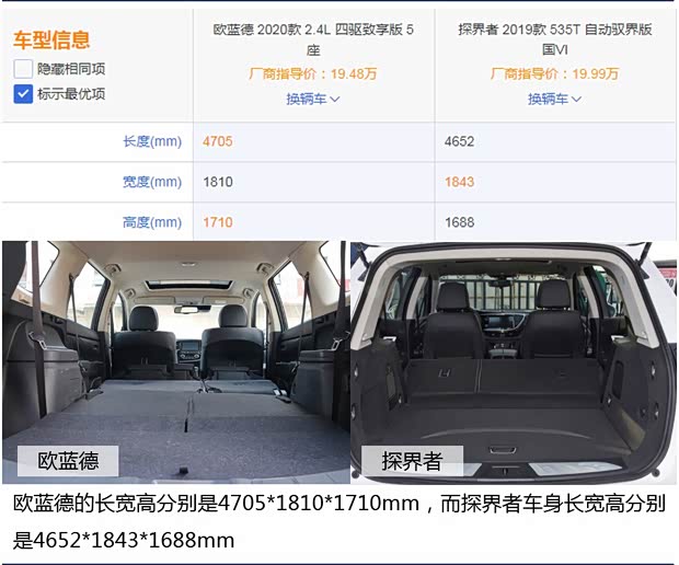灵活多变VS空间自由 能“装”才是王道 除了颜值要够高,全能多面手空间必须够用,打开后备箱就能装货,那么欧蓝德与探J者二者之间空间差距有多大,我们用数据来说话。 从数据中不难看出,欧蓝德作为一款拥有7座配置选择的SUV,即便这款19.48万的致享版是5座车型,但其车身尺寸还是要优于探J者驭界版的,4705mm的超长车身在5座的设置下,内部空间更显宽裕。 两车的后排座椅均支持按比例放倒,可以随时调节后备箱空间大小,以备不时之需。探J者后排座椅支持四六比例放倒,放倒后整体还算平整。欧蓝德后排座椅全平放倒后可形成913L的超大容积后备箱,随时可化身为“豪华移动大商铺”,上班和摆摊两不误,白天是都市精英,优雅地开着车子去公司上班;晚上化身地摊老板,载着满箱货物靠双手发财致富。