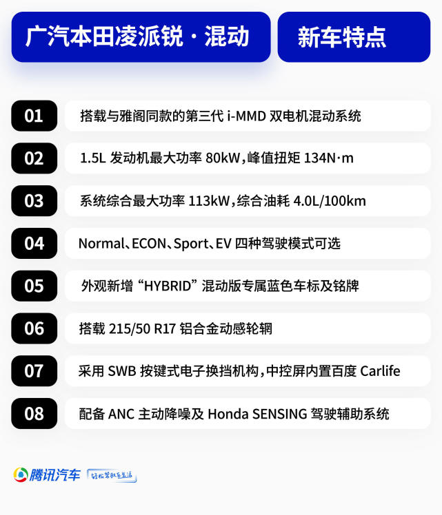 6月10日,广汽本田凌派锐·混动正式上市,新车共推出4款车型,售价13.98-16.98万元。凌派锐·混动搭载1.5L第三代 i-MMD混动系统,综合最大功率113kW,综合油耗4.0L/100km。