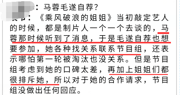 在520当天,离异的马蓉在社交平台晒出一个视频,她和女儿一起出镜,亲密互动,再次秀好妈妈的人设。自从和王宝强离婚后,马蓉一直在社交平台很活跃,除了晒自拍,或居家生活外,就是分享女儿动态,努力维护自己好妈妈形象。 马蓉在此前还说过:生活不需要比别人好,但一定要比以前过得好,对你好的好感恩。近期有消息指出,马蓉已经签约经纪公司,还要洽谈综艺节目筹备出道当明星,不过并没有看到马蓉亮相参加什么综艺节目呢。 6月14日,据资深娱记爆料:马蓉毛遂自荐想要《乘风破浪的姐姐》,不过最后惨被节目组拒绝了。 娱记表示:《乘风破浪的姐姐》当初敲定艺人的时候,都是制片人一个一个去谈的,马蓉那时候听到了消息,于是毛遂自荐也想要参加,她各种找关系联系节目组,还表示哪怕第一轮被淘汰也没关系。 不过,《乘风破浪的姐姐》有自己担心的问题,因为节目组考虑到马蓉的口碑太差,再加上其他的姐姐们都很排斥她,所以对于她的合作请求,节目组没做出任何回应。其实,这就是直接拒绝了马蓉的要求,这次复出再次失败了啊! 因为杜华打分的问题,丁当发文怒怼杜华,阿朵也发长文内涵杜华。后来杜华发文回应说:有的人可以独自闪耀,有的人可以成团光芒,不一样的优秀,都是最棒的乘风破浪的姐姐。 其实,马蓉以前也说过谁还没有个女团梦呢。有梦想很不错,可是正大光明参加《乘风破浪的姐姐》,还是需要很大勇气的。幸亏节目组没有同意,否则就会闹出巨大争议,就成了兴风作浪的姐姐了。