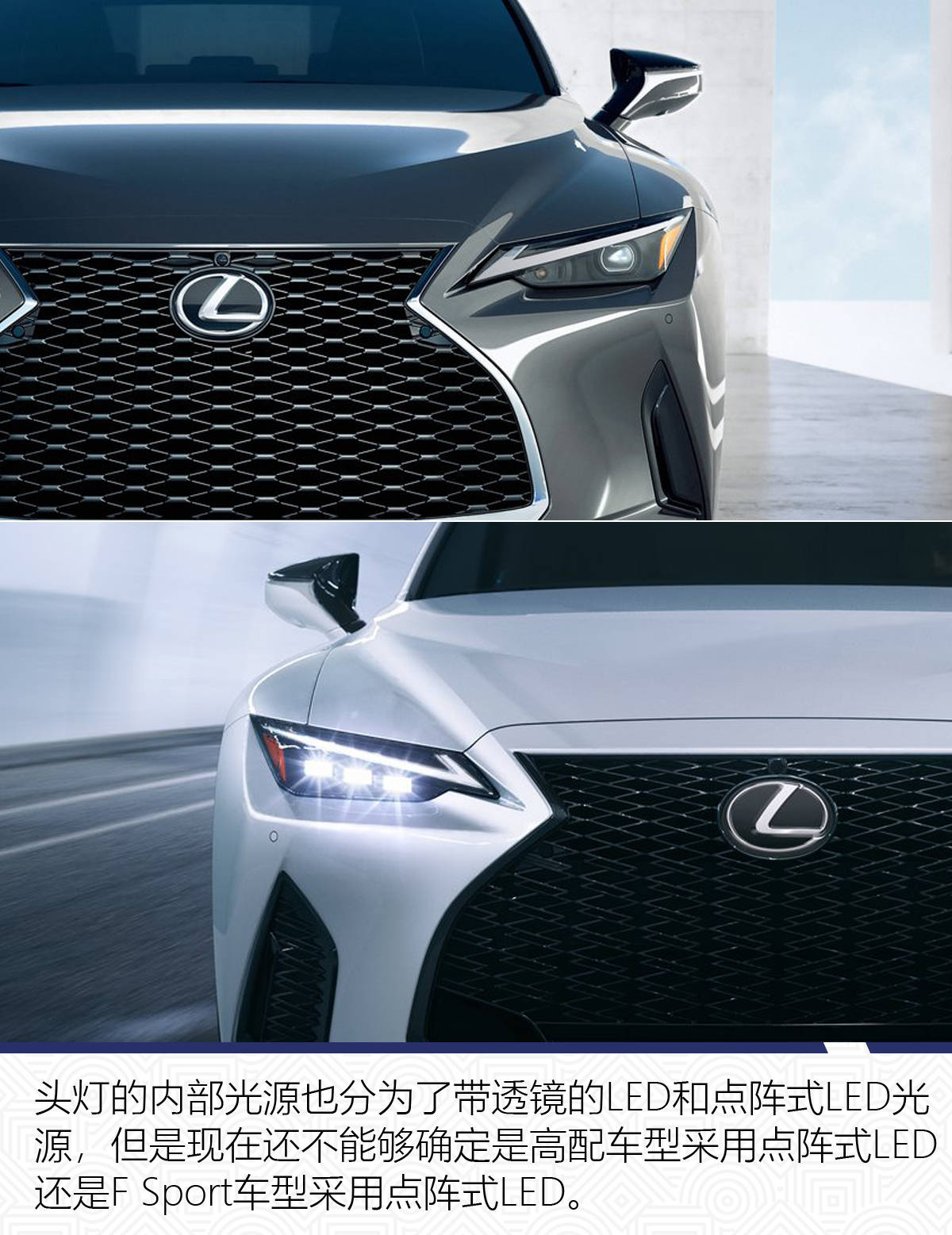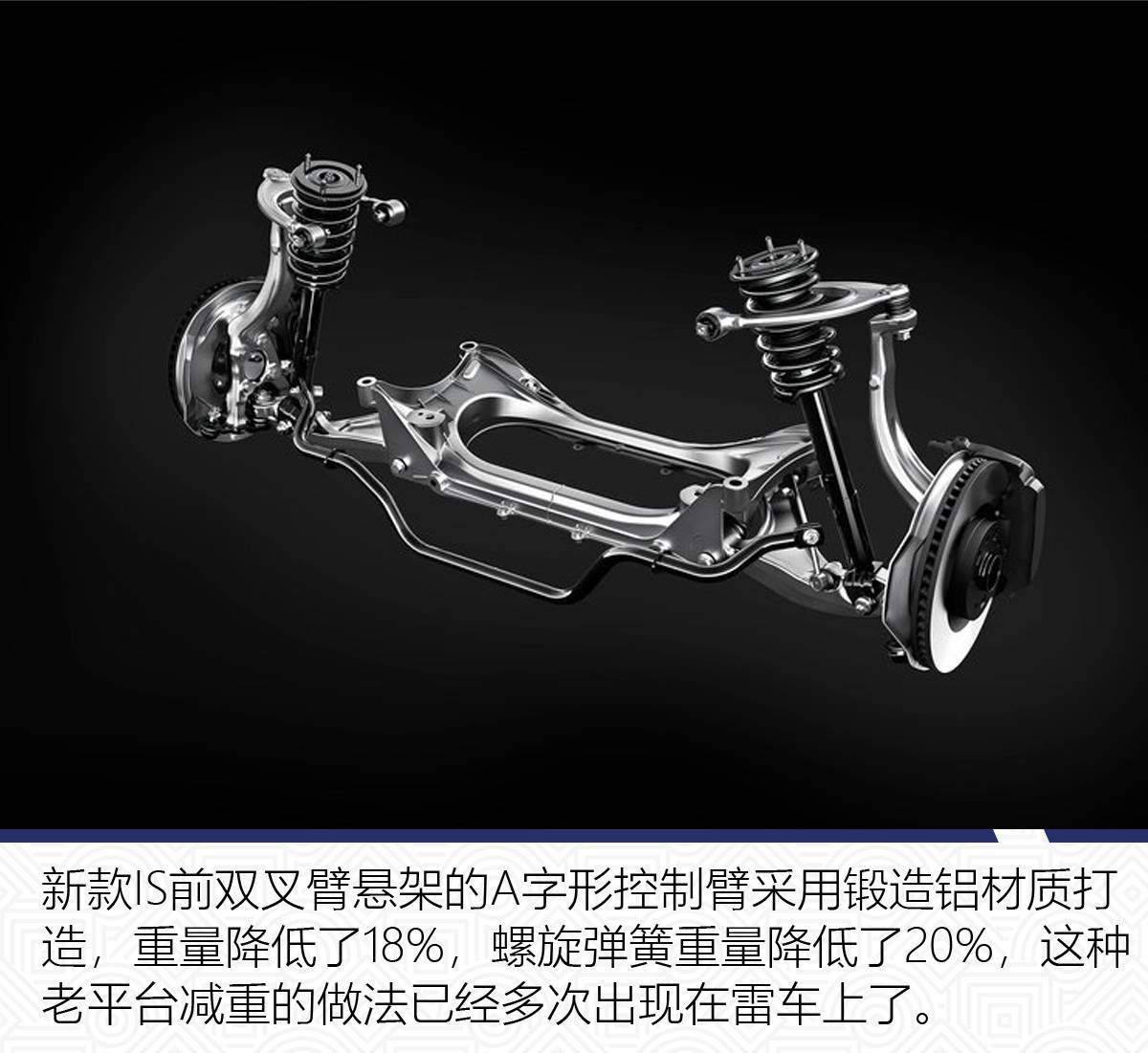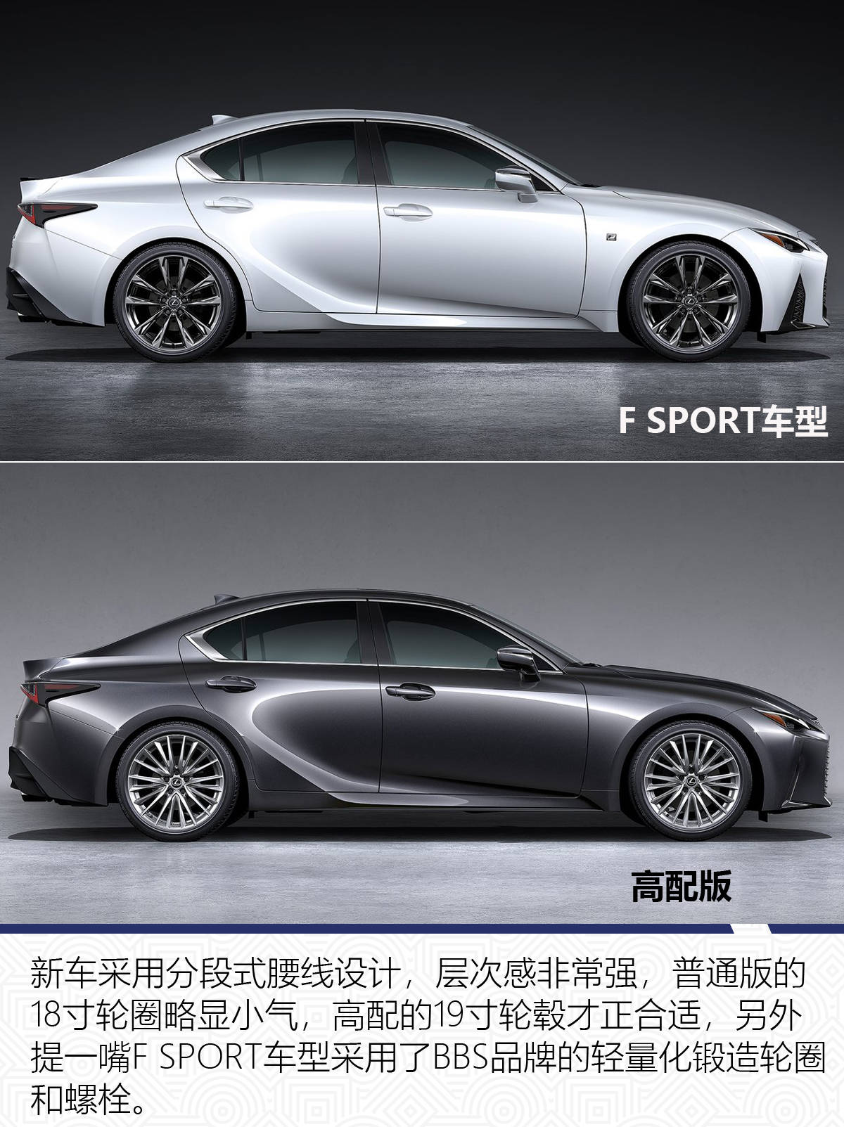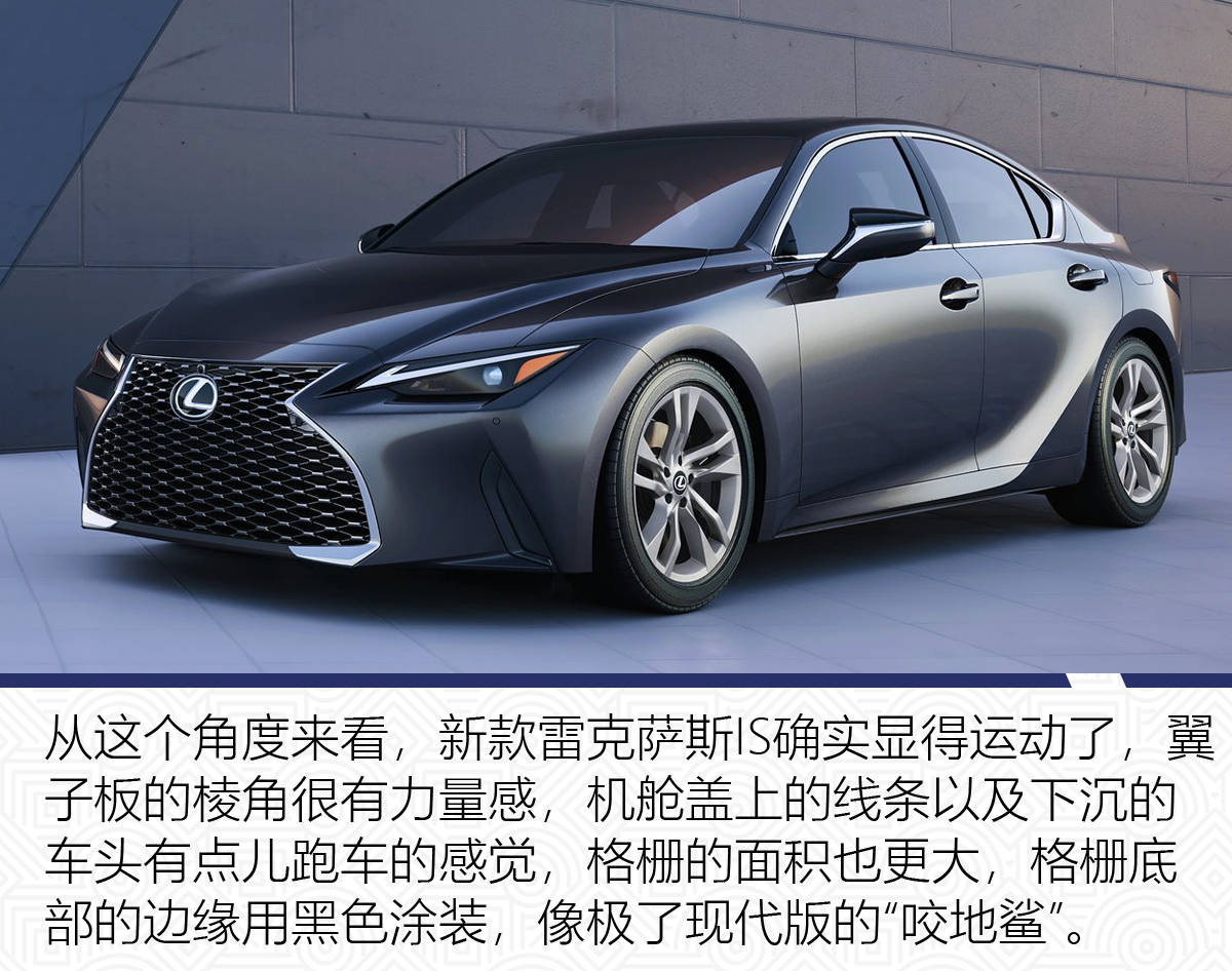 # r& F3 V3 Q! `' Y4 w- b0 C其实一开始我也半信半疑,但是一想 GS(参数|图片)车系都停产了,塞纳这种在中国曝光率不高的车都用上了TNGA架构,IS也刚好到了换代的节点,IS作为雷克萨斯目前唯一的运动Sedan,不得给车迷一个惊喜么,要不也太敷衍了事了。 但实际上,我还是年轻了,这台“全新IS”依旧用着New N平台,2.0T、2.5L以及3.5L发动机,配合6速和8速手自一体变速箱,哈哈,我笑了,这不就是改款么。 设计靠上家族旗舰跑车LC 按照发布会上公布的新车信息来看,新款雷克萨斯IS采用了新的家族式外观设计,大体上看起来跟老款车型没有相同的地方了。整个前脸的气质上更贴近家族旗舰跑车LC,前格栅的面积更大,纺锤造型的底边同样是熏黑设计,像是致敬IS鼻祖丰田“咬地鲨”的设计。日间行车灯被整合在了头灯的大结构内,一体感更强了,也可能是为了整个前脸造型而妥协。尺寸方面,新车长宽高分别为4710/1840/1435毫米,轴距为2800毫米,相比老款车型有一定的提升。 ! s; x7 \% O c' j' U8 j+ W+ v