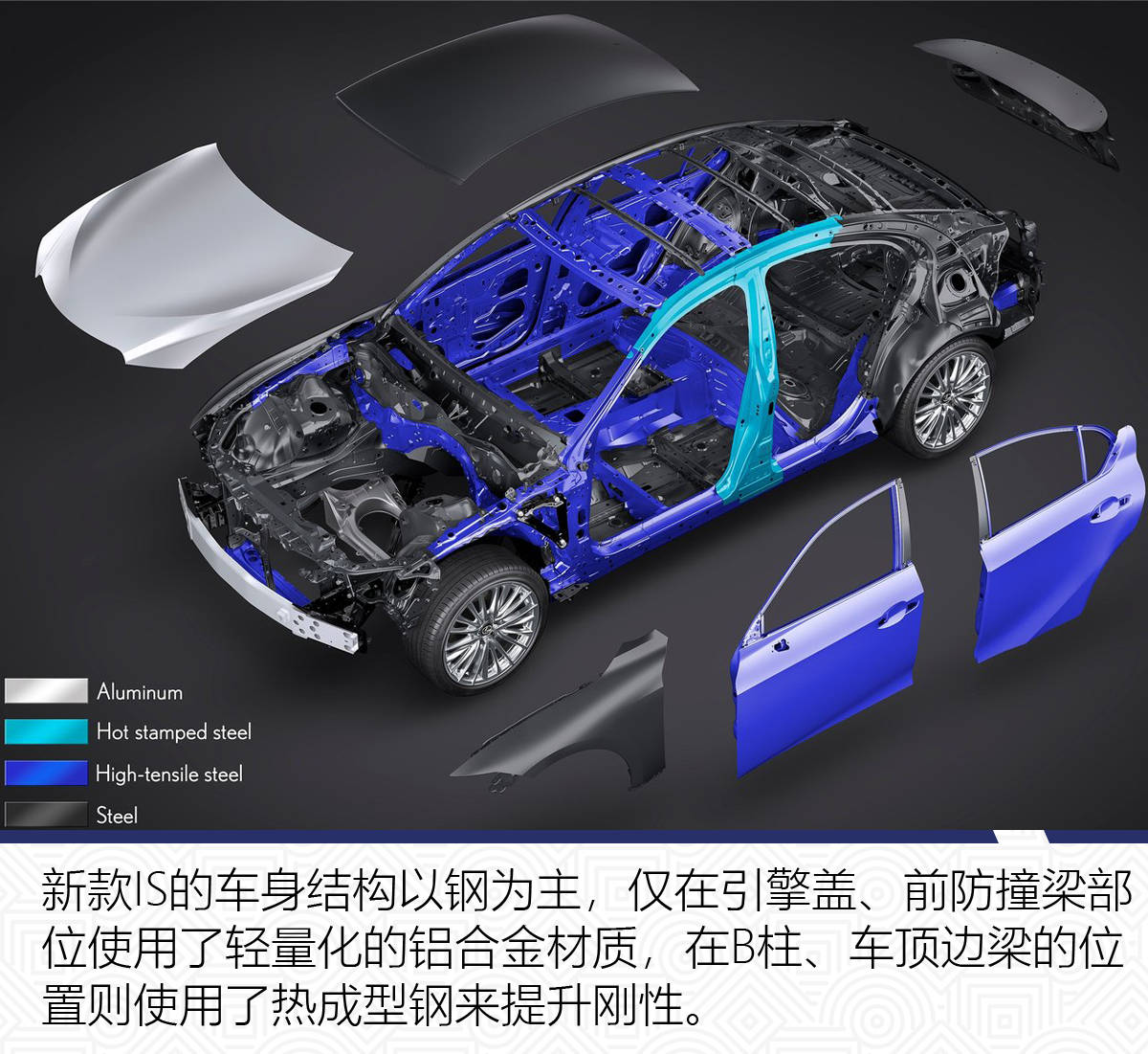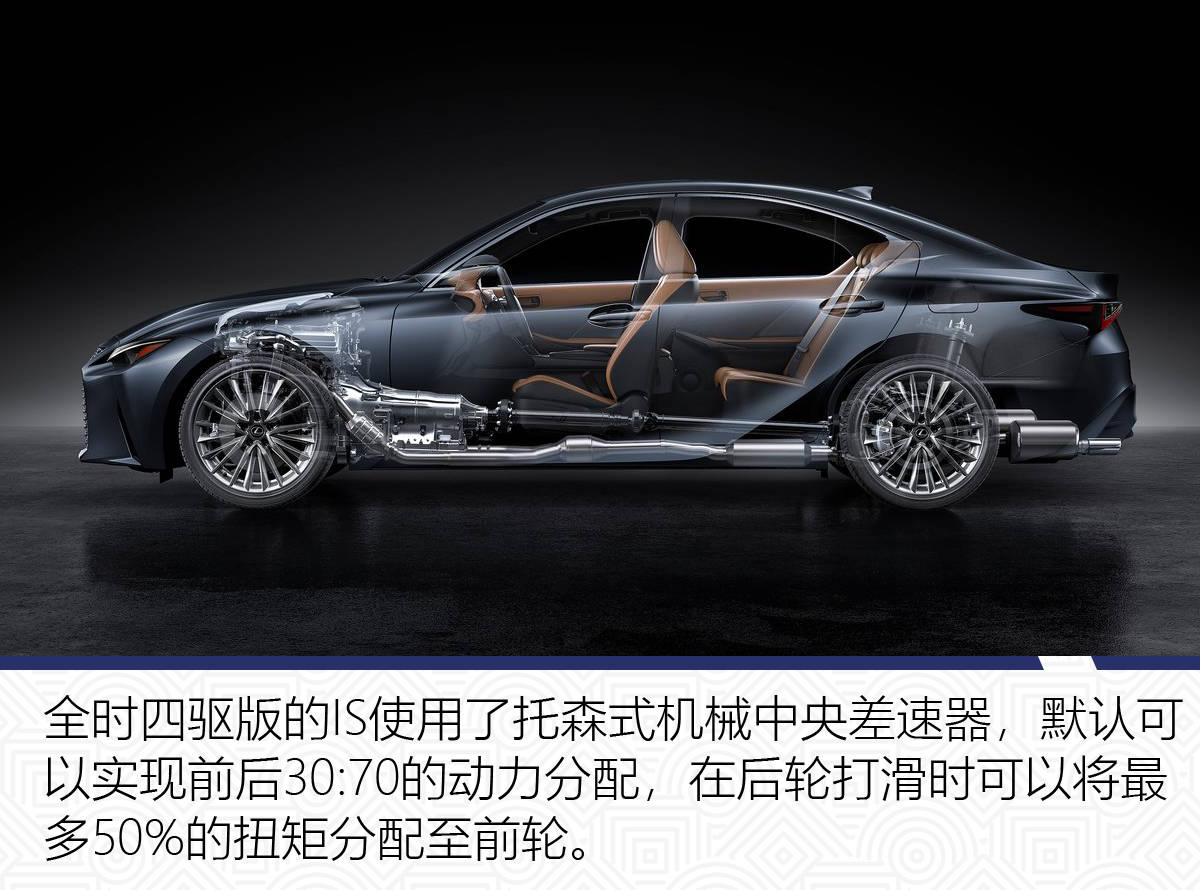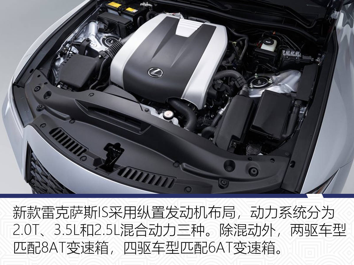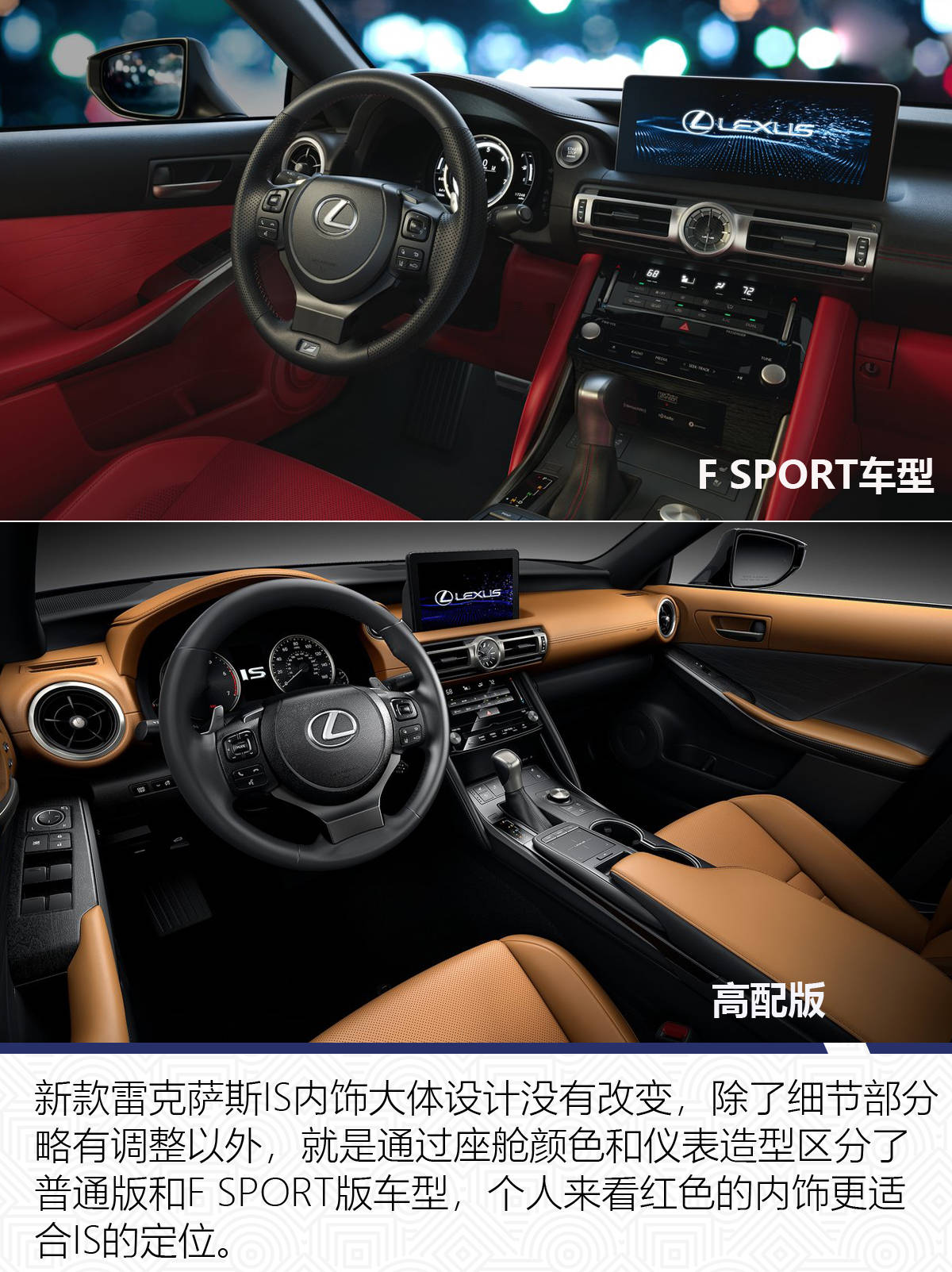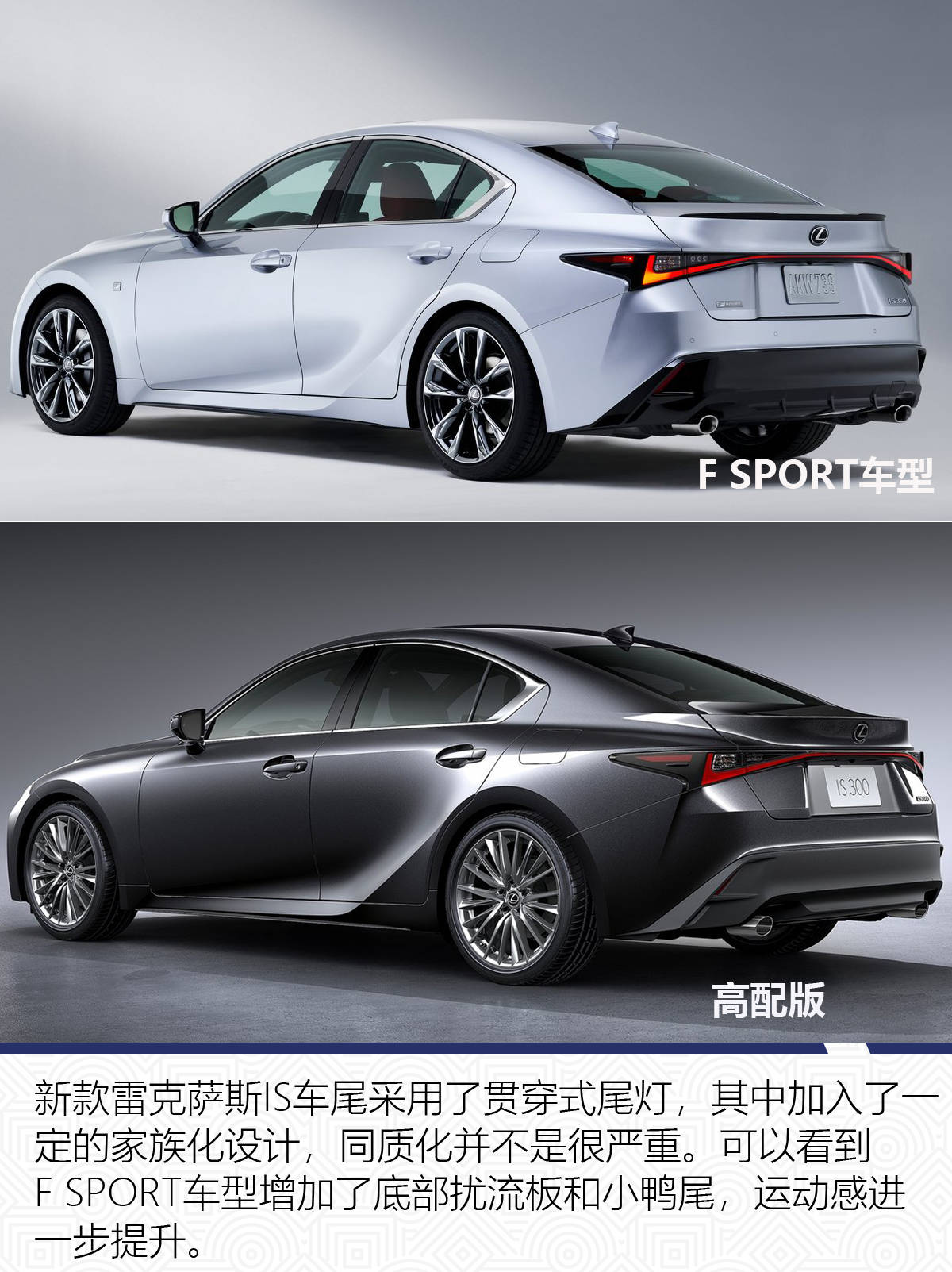 # r& F3 V3 Q! `' Y4 w- b0 C其实一开始我也半信半疑,但是一想 GS(参数|图片)车系都停产了,塞纳这种在中国曝光率不高的车都用上了TNGA架构,IS也刚好到了换代的节点,IS作为雷克萨斯目前唯一的运动Sedan,不得给车迷一个惊喜么,要不也太敷衍了事了。 但实际上,我还是年轻了,这台“全新IS”依旧用着New N平台,2.0T、2.5L以及3.5L发动机,配合6速和8速手自一体变速箱,哈哈,我笑了,这不就是改款么。 设计靠上家族旗舰跑车LC 按照发布会上公布的新车信息来看,新款雷克萨斯IS采用了新的家族式外观设计,大体上看起来跟老款车型没有相同的地方了。整个前脸的气质上更贴近家族旗舰跑车LC,前格栅的面积更大,纺锤造型的底边同样是熏黑设计,像是致敬IS鼻祖丰田“咬地鲨”的设计。日间行车灯被整合在了头灯的大结构内,一体感更强了,也可能是为了整个前脸造型而妥协。尺寸方面,新车长宽高分别为4710/1840/1435毫米,轴距为2800毫米,相比老款车型有一定的提升。 ! s; x7 \% O c' j' U8 j+ W+ v