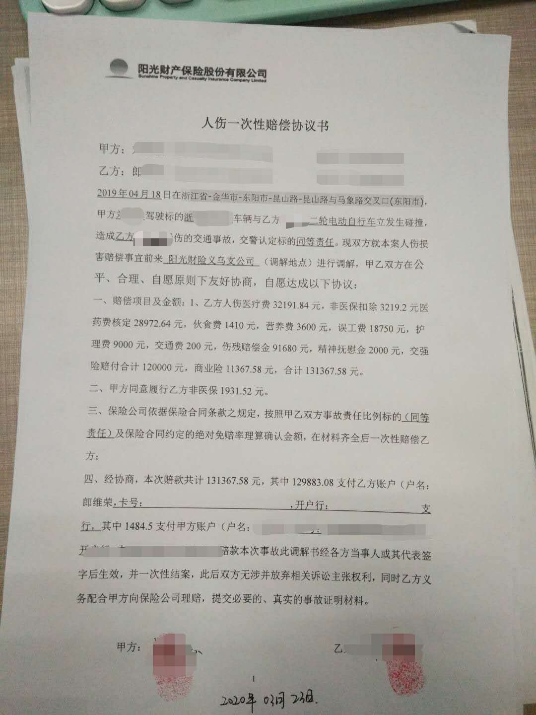 近日,浙江吕先生向澎湃质量报告投诉平台反映称,其岳父梁为民(化名)在2019年的一次交通事故中造成了颅脑损伤并致其精神障碍,经鉴定构成人体损伤十级伤残。在与肇事方刘某协商一致后,由刘某的保险公司——阳光财产保险股份有限公司义乌支公司进行赔付。当事双方于今年3月23日签订了《人伤一次性赔偿协议书》后,但该保险公司一直未能履行赔付事宜。 3月签订的《人伤一次性赔偿协议书》。 本文图片均为受访者供图 6月19日,阳光财产保险股份有限公司义乌支公司人伤部主管陈浩回应澎湃新闻称,目前公司因为周转困难,没有赔偿的资金,具体何时履行赔付要等上级领导通知。 据吕先生讲,2019年4月18日下午,岳父梁为民骑着电动自行车途径该路口,和刘某驾驶的机动车迎面撞上。该事故造成两车车损,梁为民颅脑外伤。 根据东阳市公安局交通警察大队4月19日出具的《道路交通事故抢救费支付(垫付)通知书》显示,阳光财产保险股份有限公司义乌支公司为伤者梁为民垫付了一万元医疗费。且经过初步调查,刘某驾驶的机动车在此次事故中负有同等事故责任。 手术出院后,梁为民的性格发生了巨大转变,脾气变得暴躁。吕先生说,岳父出院后情绪极不稳定,很容易发脾气,经常头晕头痛,且记忆力下降。 2019年11月6日,经过金华天鉴司法鉴定所鉴定,伤者梁为民的情况构成伤残等级评定中的十级伤残,精神医学评定中为颅脑外伤所致精神障碍(器质性人格改变),且目前存在的精神障碍与车祸存在直接因果关系。 司法鉴定评定梁为民为十级伤残。 2020年3月23日,梁为民及其家属和肇事方刘某在阳光财产保险股份有限公司义乌支公司进行了调解,双方签订了《人伤一次性赔偿协议书》。该协议书提到,由阳光财产保险股份有限公司义乌支公司赔付乙方朗维荣人伤医疗费、伙食费、营养费、误工费、护理费、交通费、伤残赔偿金、精神抚恤金等总计129883.08元。赔付甲方刘某车辆维修费1484.5元。 然而距离签订赔偿协议书过去了三个月,梁为民仍旧没有收到这笔赔偿款。 “阳光财险那边的主管4月份通知说5月中旬可以拿到赔款,到了5月,又说6月中旬可以拿到赔款,现在再问就说不敢保证了。”吕先生说,自签订《人伤一次性赔偿协议书》后,自己多次联系阳光财产保险股份有限公司义乌支公司,但至今没有拿到赔偿款,也没有给出确切的赔付时间。 对此,6月19日,阳光财产保险股份有限公司义乌支公司人伤部主管陈浩回应澎湃新闻称,目前因为公司资金困难,没有多余的资产,暂时不能进行赔付,并称整个义务地区其他的案子也都没有进行赔付。 “我们协议书已经签过了,只是履行慢一点,是多少金额最后肯定会赔付的。”对于具体赔付时间,他表示要等领导通知才能打款,还无法确定。