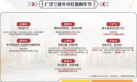 广汽三菱年中狂欢购车节,钜惠福利等你来 为所有都市家庭2020新生活助力,此次车展,欧蓝德更携超值7重礼遇带来最具“驾值”的购车体验。 首付只需1.28万起,月供低至2800元,超长贷款期、3年0利息等金融福利进一步减轻购车负担,置换欧蓝德至高还有8000元补贴(限牌城市至高10000元)。除此之外,广汽三菱年中狂欢购车节也正在火热进行中,为您带来一场夏日狂欢购车趴。