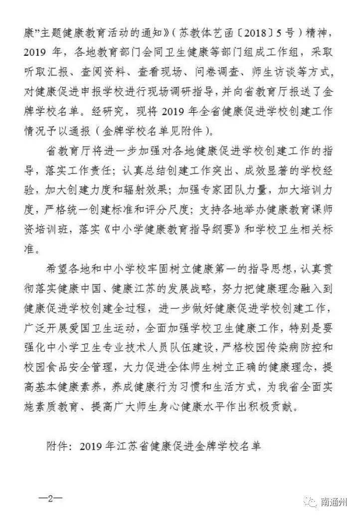 近日,江苏省教育厅发布公告,南通市南通师范学校第二附属小学等18所中小学荣获省健康促进金牌学校称号。 据了解,省健康促进学校创建始于2006年,要求创建学校重在健全制度,落实学校健康政策、完善设施,改善学校物质环境、引领示范,打造过硬师资队伍、健康育人,提升个人健康技能、加强管理,提高健康服务质量等各项措施的常态化落实。省教育厅希望通过健康促进学校创建工作,努力构建学校体育和卫生工作平台,强化广大师生的健康理念,改善学校设施条件,提升学生体质健康水平。 市教育局表示,希望各地各校牢固树立健康第一的指导思想,认真贯彻落实健康中国、健康江苏的发展战略,努力把健康理念融入到健康促进学校创建全过程,进一步做好健康促进学校创建工作,广泛开展爱国卫生运动,全面加强学校卫生健康工作,特别是要强化中小学卫生专业技术人员队伍建设,严格校园传染病防控和校园食品安全管理,大力促进全体师生树立正确的健康理念,提高基本健康素养,养成健康行为习惯和生活方式,为我市全面实施素质教育、提高广大师生身心健康水平作出积极贡献。 2019年南通市健康促进金牌学校名单 江苏省南通师范学校第二附属小学 南通市北城小学 南通市虹桥二中 如东县宾山小学 如东县掘港高级中学 如东县茗海中学 如皋市白蒲镇阳光初级中学 如皋市长江镇郭园初级中学 如皋市长江镇郭园小学 如皋市江安镇葛市小学 如皋市江安镇江安小学 南通市通州区通海中学 南通市通州区二甲中学 南通市通州区四安中学 江苏省通州中等专业学校 通州区实验中学 江苏省通州区刘桥中学 南通市通州区育才中学 新闻链接