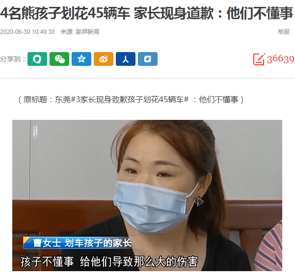 这几天,一则“东莞4小孩划伤数十台车被索赔150万,家长反应气炸车主”的消息,引发网友的关注。 报道称,在6月21日,东莞一小区内,有30多辆车辆被4个10多岁的孩子划伤,其中不乏宝马、林肯、奔驰等豪车,这些孩子下手也狠,有的车几乎全车都是划痕。据初步估计索赔总额可能要达到150万元。 车主自然是要找这些孩子家长讨说法,按理说划了别人的车原本就理亏,况且还可能面临巨额赔款,搁谁都心慌,但这些家长们却很淡定,事发后对此事不理不睬,还表示将采取“反告”动作。 所谓“反告”无非是以孩子小不懂事为借口,将自己放到受害者位置,而责任主要是在没尽到管理责任的物业公司和将车停在小区内的公共场所的车主。 在警方介入之后,家长们的态度有所改变,据警方通报,四名儿童的监护人对儿童的行为进行了批评教育,公开向遭受损失的车主道歉,并表示愿意积极承担相应责任。公安机关正积极引导各方通过法律程序妥善解决问题。 目前,事件还在进一步处理中。 6月29日,3名家长现身公开道歉,“对不起每一位车主,孩子不懂事导致造成伤害”。 网页截图果然还是“孩子不懂事”,这大约已成为孩子犯错免责的天然借口,但是说年龄小不懂事,多小才能不懂事呢?“融七岁,能让梨”,七岁的孔融礼让之意不输成人,而前些日子看到一则新闻,三十多岁的男子在家“啃老”,母亲却称他还是个孩子。 或许在父母眼里,犯了错的子女都只是个不懂事的孩子,但是社会是不会这样宠着他的,犯了错就应当受到惩罚,而不仅仅说一句:“这个熊孩子!”没有规矩不成方圆,但规矩不是天生就懂的,是需要他们在成为熊孩子之前就要教育到的,这是家长的责任。 所以,划车的4个熊孩子家长既然没有尽到教育的责任,那么就应当承担车主的损失,你不管,总有人会替你管,孩子承担不了的责任,父母就得来承担,这是抚养孩子应当具备的觉悟,家庭教育的失败,后果绝不应该由社会承担,也只有这样,父母们才会让孩子早点“懂事”。