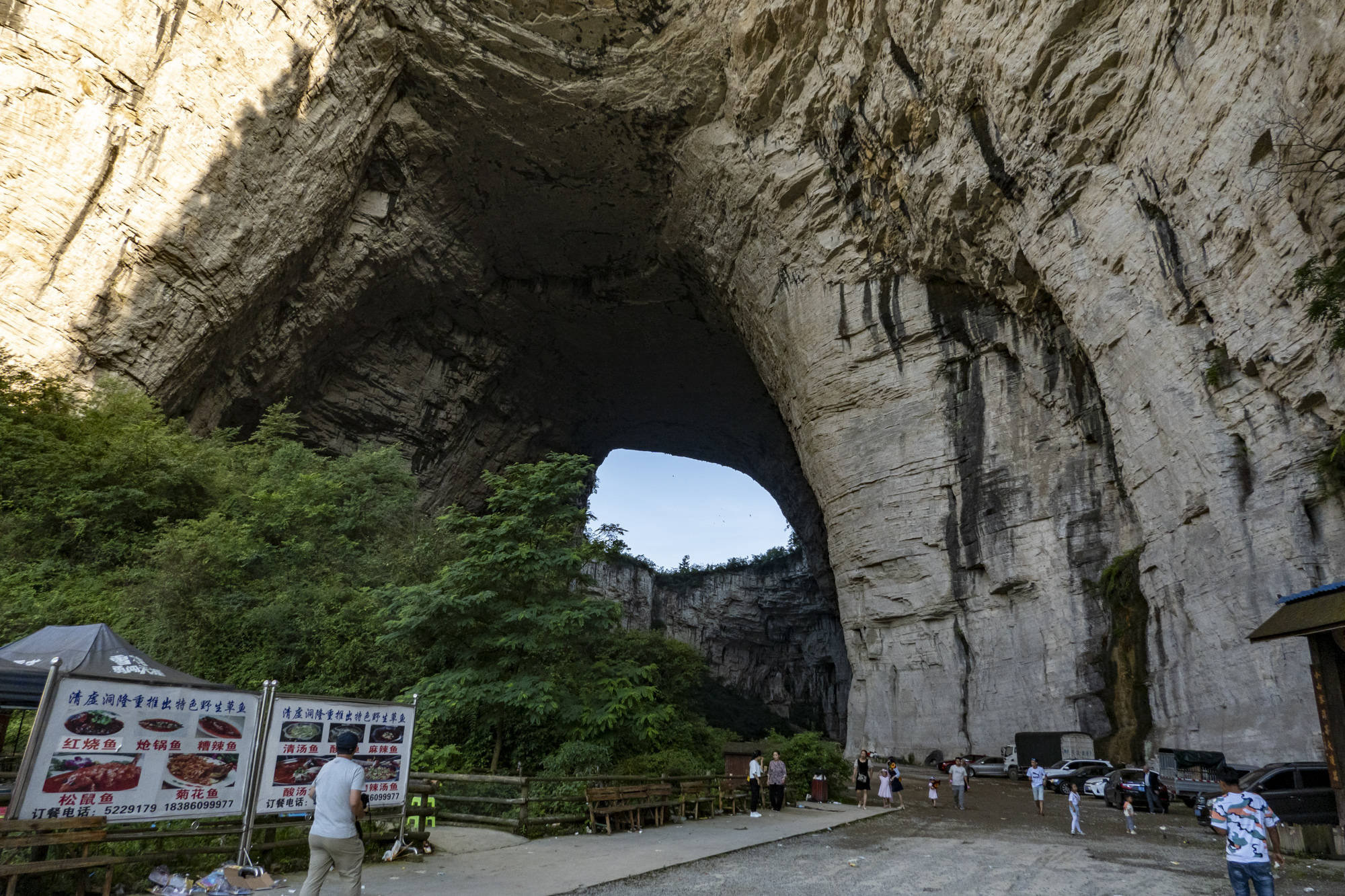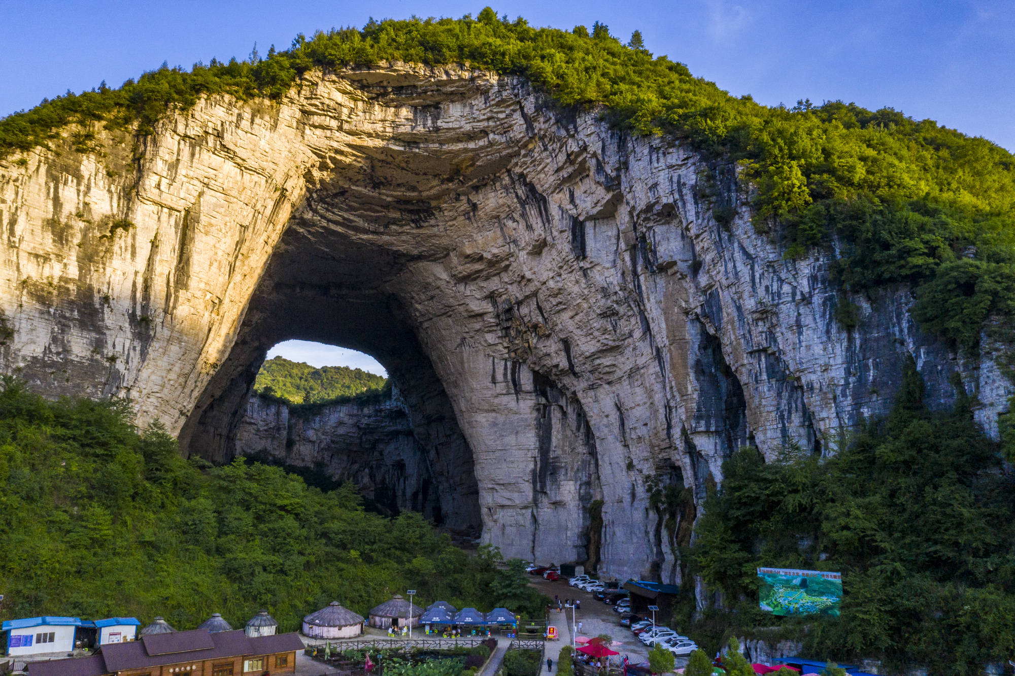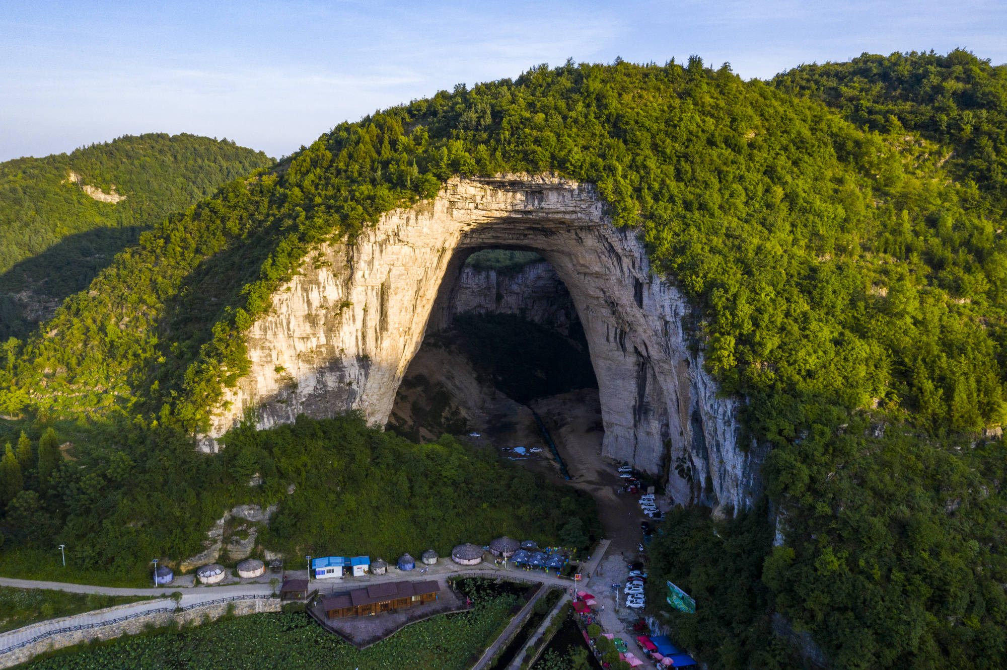 贵州是中国最多山的省份,也是我国唯一没有平原的省份,贵州有句俗语说“天无三日晴,地无三尺平”,又说“九山半水半分地”,这很贴切的形容了贵州的地形地貌。 贵州山多,山洞也多,有贵州的朋友形容,只要你在贵州自驾,沿途山上处处有洞,而且一个比一个大。以前我觉得有点夸张,不过近日在贵州自驾我是亲身体验了贵州的山洞之多,之奇,之险,堪称溶洞王国,令人叹为观止。 贵州的山洞我觉得可以分为普通山洞、溶洞和天生桥洞,最出名的有织金县的织金溶洞,纳雍县的九洞天天生桥等等,不过在毕节市还有一座山洞为世界之最,它就是大方县的清虚洞。 大方县 位于贵州西北部,2020年被评为中国夏季休闲百佳城市,境内有慕俄格古城、奢香古镇等,贵州朋友说在山里有个清虚洞,值得一看,我带你们去感受一下世界之最。 从大方县城导航到清虚洞需要半个小时路程,不过贵州的山路难行,山里的公路也狭窄,两车相会需要特别谨慎,所以10多公里的路程,经过40多分钟我们才到了大方县羊场镇陇公村,这里就是清虚洞的所在地,一个巨大的天生桥山洞矗立在我们面前,那种顶天立地的气势迎面而来,令人惊叹。 来到这里那日正赶上端午小长假,出行的游客很多,清虚洞的前面已经排起了许多摊位,都是一些当地的村民,而在清虚洞里依然成了一个宽阔的停车场,许多来参观的轿车停放在了里边。 从路边竖立的规划牌上可以看出,当地对清虚洞进行了愿景规划,将来要把这里打造成一个旅游景点,不过现在这里是免费的。 清虚洞的前面是一片上百亩的荷塘,由于不是荷花盛开的季节,所以只能看荷叶翠绿,莹润清雅。而清风洞则不同,更显威武庞大,气势逼人。查了资料了解到了它的一些数据,1998年,美国洞穴基金会、贵州师范大学地理系组成联合考察队,对该洞进行实地测量,该洞桥高178.25米,跨高105.25米,拱桥跨度最大处127.35米,最小处77.69米,桥身长400米,宽200米。 洞内的面积约5000平方米,在洞的后侧有一个巨大的天窗洞,在四壁也还有许多山洞,再往里走,还有一个巨大的山洞,漆黑一片,深不可测,由于没有探照工具,我们未敢贸然前行。 据现存的世界各国类似清虚洞溶洞的数据资料论证,该洞的规模比之前报导的称超过了世界吉尼斯记录的贵州黎平高屯天生桥更为宏大。目前,清虚洞天生桥已申报世界吉尼斯世界第一的请求,并已被大世界上海吉尼斯总部接受。 清虚洞以其独特的天窗结构和巨大的拱桥而闻名,其顶接蓝天,洞吞日月,确实一处壮丽的溶洞奇观。 别看这只是一座山洞,其实它还有许多历史故事。在清朝时由于匪患猖獗,为了保一方太平,这里曾经修筑了围坪和营盘,用来避匪多年。 民国时,这里又被僧人占用,修筑庙宇,取名清虚洞。曾经诵经声不息,香火旺盛。 在上世纪40年代初,这里还曾作为中国中国第一航空发动机制造厂铸造车间和螺旋桨生产车间。蒋介石曾站在清虚洞天桥下,向航发厂的1700多名员工训话,发出了“我们发动机何时才能完全自制”的天问。 清虚洞内还有一条河很特别,许多河都是由洞内流向洞外,而这里的的河是由洞外流向洞内,一直流向了洞内的最深处,到底它流向了哪里,至今是个未解之谜。 夏天来这里避暑是个不错的选择,四周青山叠翠,山下溪水潺潺,许多错落点缀在山涧,让人有种“久在樊笼里,复得返自然”之感。夕阳唱完,微风轻拂,荷塘里的片片荷叶摇曳,空气里满是淡淡的清香,许多游人在这里拍照、小憩,感觉生活十分的惬意。不远处,便是气势宏伟的清虚洞,令人不得不感叹大自然的鬼斧神工。这里真的是一个“看得见山、望得见水,感受得到乡愁”的好地方。 2 E1 p6 b" t" i) A" e