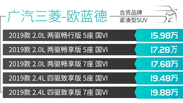 作为三菱旗下的主力军,三菱欧蓝德凭借着在国内市场上多年的征战,可谓积攒了众多的良好口碑,而随着加入国产的阵列之后,欧蓝德无论在硬派的四驱系统抑或是丰富的配置上都能够凸显出极具的性价比。因此,在国内紧凑型SUV的市场里,从来不缺少欧蓝德的身影。 2019款欧蓝德共推出了5个版本,售价区间为15.98-22.58万元,以兵哥推荐的车型为例,官方指导价为19.88万元,加之目前拥有高达1.8万元左右的终端优惠,其落地价格在20.5-21.5万元之间。