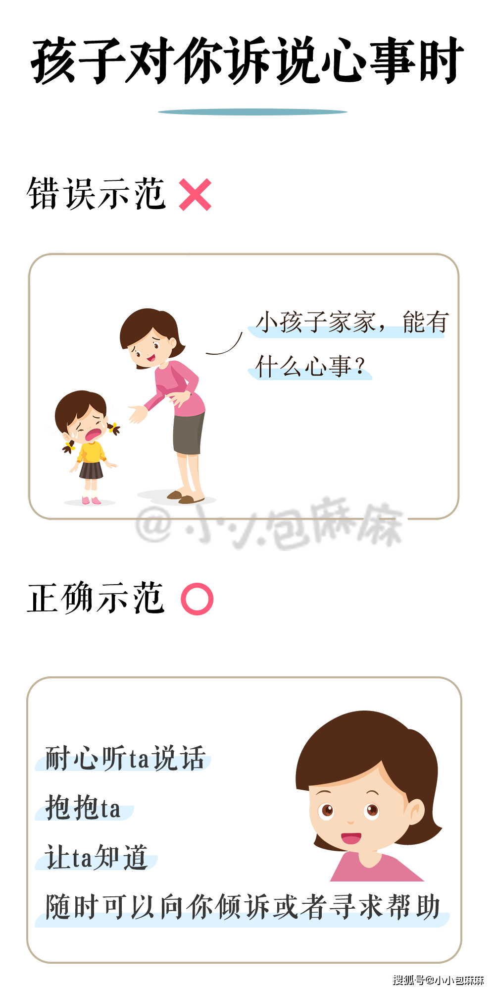 知乎上有个高热搜索,“父母对你伤害最大的一件事是什么?”有近2万个回答。 看完后会发现,父母随口而出的一句话,真会变成压在孩子心头的一座山。 和孩子沟通有多难,只有做了父母后才有切身体会。不管你是销售精英,还是公司主管,只要是初为人父母,面对不按常理出牌的孩子,真是空有一身功夫却使不出来。 很多人都知道不该对孩子喊叫发脾气,但有时真的会被逼疯。其实想要和孩子建立起有效沟通,就要引导孩子克服消极情绪,让他们卸下防御、愿意表达,而所有的理论和方法核心,概括起来就是两个词——“理解”与“尊重”。 包妈希望你从没听过下面这些话,也永远不要对孩子说这些话。 👇 👇 👇 👇 👇 🌱 几乎没有父母愿意伤害自己的孩子。然而当孩子犯错的时候,很容易就会情绪先于理智。 而孩子在一次次被伤害之后,会慢慢放弃和父母沟通,不说,不听,不回答。 孩子对父母的信任是天生的,却不是永久的,后天的信任取决于孩子成长过程中,你给过ta多少理解和包容。 其实和孩子保持良好沟通的办法很简单,2个字——倾听。 - 当孩子向你倾诉时,哪怕你觉得ta说得很无聊,也请停下手中的事,认真倾听。