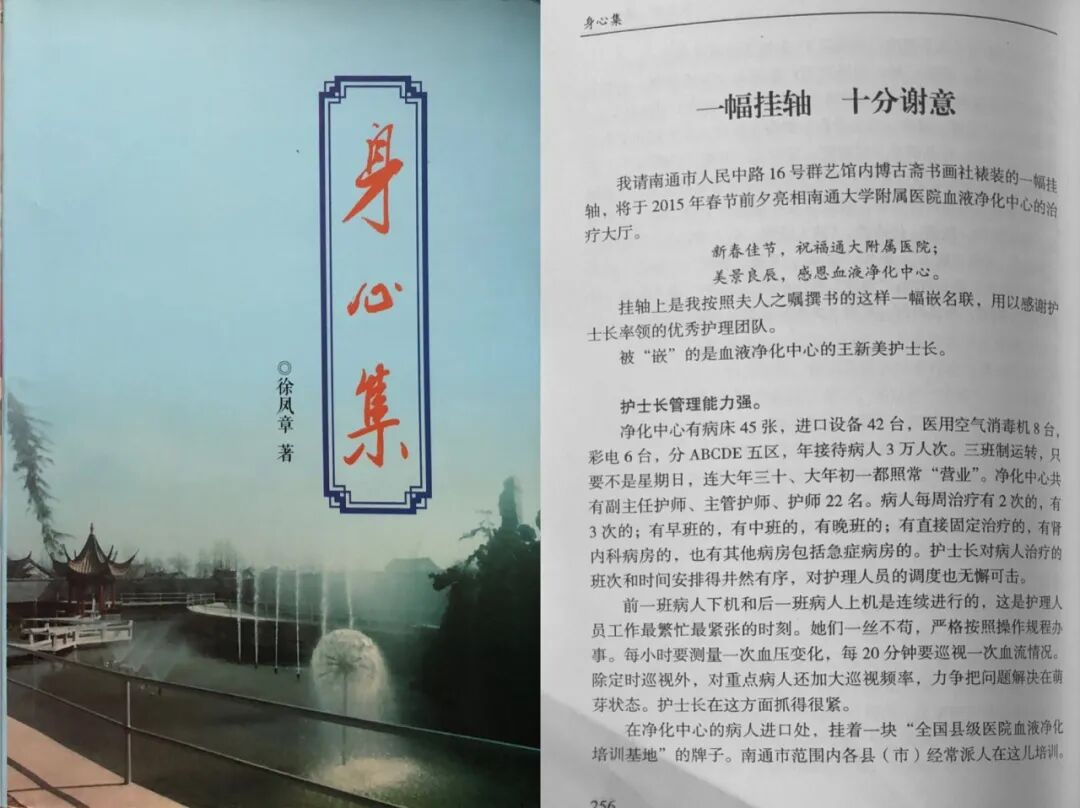 徐老是一名老知识分子,他平常就爱好写字、做文章。在徐老著的书《身心集》中,还有专门的一章《一幅挂轴 十分谢意》,来讲述他陪同老伴儿在血液净化中心做透析的的故事。2015年春节前夕,他做了一幅对联:“新春佳节,祝福通大附属医院;美景良辰,感恩血液净化中心。”这是一幅嵌名联,被“嵌”名字的就是护士长王新美。