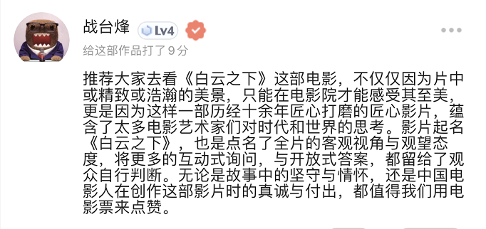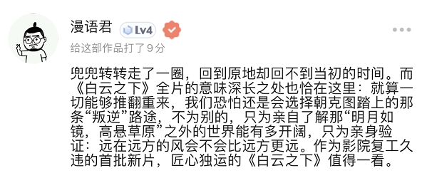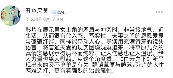 由王瑞执导,陈枰编剧,吉日木图、塔娜主演,艾丽娅、涂们等人特别出演的《白云之下》,7月31日全国上映了! 这部文艺性质的电影,历时十余年的孵化,灾后疫情时代得以诞生,点映过后,收获无数观众的推荐和好评。 为什么这部电影会让人这么喜欢呢? 因为它不仅仅是中国第六代导演王瑞的又一力作,且获得过2019年东京国际电影节主竞赛单元最佳艺术贡献奖,是入围主竞赛单元唯一中国影片,同时还作为2020上海国际电影节“一带一路电影周”的开幕影片,唯一华语片代表。 为防止剧透,小编在此简略讲一下剧情,这是发生在呼伦贝尔大草原一个普通家庭夫妻之间的故事,而这个故事是从主人公朝克图萌生去外面看看的念头开始,之后发生的种种点滴,都是在诠释着“选择和妥协”的背后意义。 萨如拉是一个阳光勤劳的女人,她和很多蒙古族女生一样,爱草原爱家人,而她的丈夫朝克图却有一颗想走的心,对外面的世界充满着好奇。 朝克图一次又一次的偷偷溜走,萨如拉也越来越害怕他的消失,为此两人陷入了深深的苦恼,朝克图对妻子萨如拉有着依赖与不舍,萨如拉对丈夫朝克图有着包容与放纵。当矛盾开始,双方都开始变得迷茫与焦虑。 一面是回归故乡的安逸生活,一面是跳出舒适圈走向外面世界,这种当代草原人所面临的难题与困惑,与当下我们的生活息息相关,就像是生活在农村、城镇的人,也都面临着同样的问题,亦是影片的亮点所在 。 影片除了故事情节真实自然,深入人心,演员们精湛的演技,也是收获了一致好评。同时更有金马奖影帝涂们和金爵奖、金鸡奖、华表奖三大影后艾丽娅也倾情助阵。 值得一提的是,里面的取景和音乐更是为其增色不少。电影扑面而来就是绝美的草原画卷,几乎每一帧都是壁纸,配上国际知名乐队恒哈图乐队的献声,为影片的纯净气息加分不少。 骏马飞驰,呼麦声悠扬,把自然与人物、环境与故事巧妙结合在了一起。不仅铺展了风景辽阔的呼伦贝尔大草原,原始的呼麦之音,更是贴近了追梦人内心的想法和情感。 这样一部好看又有品味的国产电影,可以满足大家对好电影的所有期待。没有肤浅的浪漫,只有日出而作日落而息的质朴纯粹。 影片中的情景,会让人感受到一种油然而生的活力,让看过的观众不禁想买张飞机票去草原,感受一下它的波澜壮阔。 《白云之下》既有大银幕的大气也有浓浓的人文气息,写实的魅力,在于它的娓娓道来,简单的故事蕴藏着丰富的内涵,有着强烈的治愈属性。 影片从想法产生到最终与观众见面,跨越了十多年的时间,力求真实再现少数民族人们的日常生活,探讨个人自由的选择与妥协,引人深思。 这样一部极具情怀的“中国式电影”,值得一看!