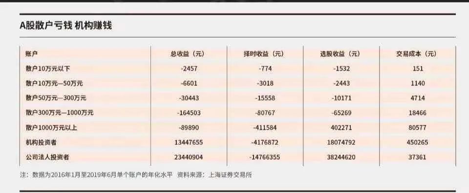 一则来源为上海证券交易所的单账户年化收益的统计数据,在行业里激起了不小的浪花。 该数据显示,A股散户,无论是账户在10万以下的“超级小散”,还是资金量在千万级别以上的超高净值人群,2016年1月至2019年6月期间,单账户平均年度收益均为负值,只有机构投资者和公司法人投资者在此统计区间内实现了单账户的平均年化正收益。 此外,值得警醒的是,个人投资者(账户资金量在0-1000万以上不等)、机构投资者、公司法人投资者在统计区间内依靠择时均未能实现盈利,仅有机构投资者和公司法人投资者依靠选股实现了正收益。 “投资者主动参与资本市场是没有效率的,而专业机构参与资本市场是有效率的。换句话说,资本市场机构化是一个大趋势,这是大家会逐渐意识到并形成的共识。”一位券商研究人士表示。 这也意味着,A股市场的有效性正在提升,算法交易不断迭代升级,普通投资者越来越不适合参与短线交易机会,应树立中长期投资理念,借道专业资产管理机构参与资本市场。 散户亏钱,机构赚钱 上海证券交易所数据显示,个人投资者,从2016年1月-2019年6月的统计区间,无论资金体量如何,但账户年化收益均为负值,只有机构投资者和公司法人投资者单账户实现了平均正收益。 具体来说,统计区间内,市值10万元以下的散户,单账户平均年化收益为-2457元,择时收益为-774元,选股收益为-1532元,交易成本为151元;市值在10万-50万元的散户,近三年平均年化收益为-6601元,择时收益为-3018元,选股收益为-2433元,交易成本为1140元;市值在50万-300万的散户,单账户平均年化收益为-30443元,择时收益为-15558元,选股收益为-10171元,交易成本为4714元。 市值在300万元以上的散户平均下来同样亏钱。市值在300万-1000万元的散户平均年化收益为-164503元,择时收益为-80767元,选股收益为-65269元,交易成本为18466元;市值在1000万元以上的超级“大户”,近三年平均年化收益为-89890元,择时收益为-411584元,选股收益为402271元,交易成本为80577元。 统计时间范围内,机构投资者在A股的投资收益颇丰。数据显示,机构投资者近三年平均年化收益为1344.77万元,择时收益为-417.69万元,选股收益为1807.48万元,交易成本为45.03万元;公司法人投资者近三年的平均年化收益为2344.09万元,择时收益为-1476.64万元,选股收益为3824.46万元,交易成本为37361元。 不难看出,无论是亏钱的散户还是赚钱的机构投资者,依靠择时都无法实现正收益。 “择时只是一种神话。而选股方面,拥有的资源越多,资金量越大,在选股上就越能体现出优势,因为只有真正有钱有资源的人才能有效地去收集信息、识别信息、解读信息,最后利用信息做出正确的选择。”上海证券基金研究中心负责人刘亦千告诉券商中国记者。 此外,市值10万到1000万之间,同等规模条件下,单位规模的交易成本资金量越小的成本越高,市值1000万以上的交易成本明显更少,说明频繁的交易也是投资失败的一个重要因素。 不只个人投资者在A股市场择时普遍失效,机构投资者在择时上的损耗也大于收益。如果是个人投资者以购买基金的形式参与资本市场,择时亦对基民回报有明显拖累。 上海证券此前一份研究报告显示,绝大部分产品的投资者回报都落后于产品收益;其次,市场环境越复杂,择时成功率越低;投资者择时创造的正回报水平远小于择时造成 的业绩拖累;具有更好流动性的产品并未改善投资者择时效益,它们受市场环境的影响更为剧烈。 这也解释了为什么“基金赚钱而投资者亏钱”的现象。即投资者在最近三年内的择时效益普遍不佳,绝大部分的投资者在择时过程中并没有创造更好的收益,反而是拉低了投资者回报水平。 公募基金上半年利润达到7268.52亿 作为机构投资者的重要组成部分,公募基金正在给投资者带来实实在在的丰厚回报,“炒股不如买基金”的理念愈发深入人心。 公开数据显示,2019年公募基金实现利润总额1.17万亿元,创下历史新高。其中,混合型和股票型是盈利的主要来源,全年利润总额分别为5218.26亿元、2993.08亿元。其次是货币型和债券型公募基金,全年利润总额分别为1967.81亿元、1398.71亿元。 最新披露的公募基金2020年二季报显示,2020年上半年纳入统计的9381只公募基金产品上半年合计利润达到7268.52亿元。 从基金公司来看,上半年盈利前三分别是易方达基金、广发基金和汇添富基金。具体来看,易方达基金旗下276只基金产品,上半年利润总额达到了483.57亿元;广发基金旗下有319只基金产品,上半年利润总额为461.18亿元;汇添富基金旗下228只基金,上半年利润总额为401.07亿元。 另外,2020年上半年有22家基金公司公募基金产品总利润突破了100亿,有11家基金公司公募基金产品总利润突破了200亿,分别是易方达基金、广发基金、汇添富基金、富国基金、华夏基金、南方基金、嘉实基金、中欧基金、兴证全球基金、工银瑞信基金和交银施罗德基金。