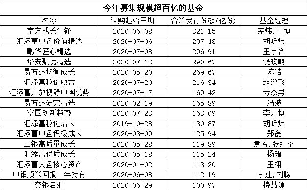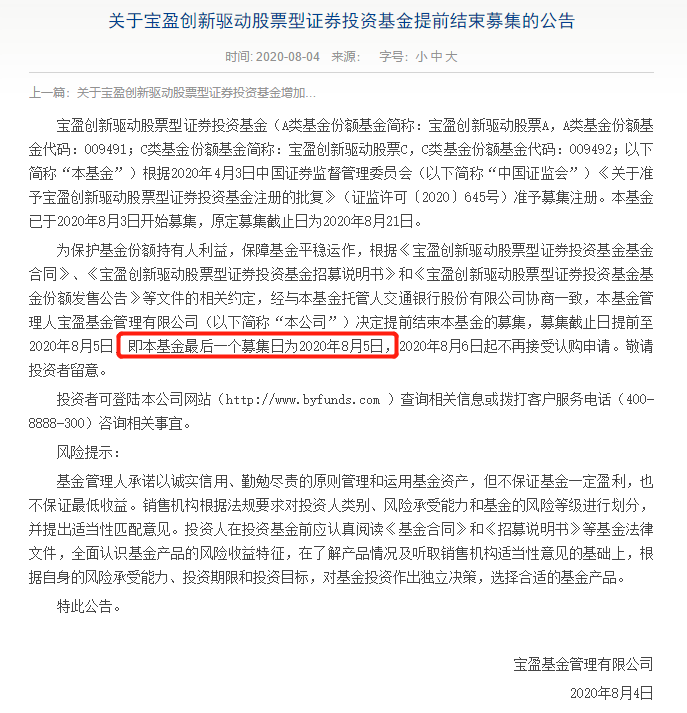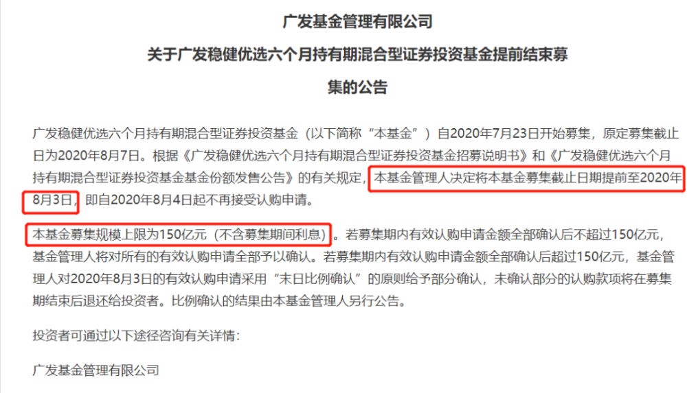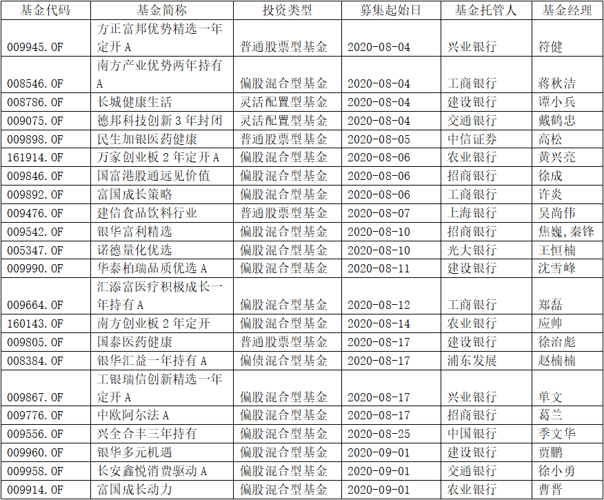 2020年8月首个交易日,A股大涨57点,科创板和军工股飙升,市场做多热情再次点燃。 正在8月3日,主动权益基金发行一改上周偏“冷”的情况,数只基金都传出“发行超百亿”的消息。基金君从渠道了解到消息称,目前广发、中欧、景顺长城等公司都诞生百亿级爆款基金,显示出主动权益基金发行市场的持续火热。而伴随着后续还有多款新基金进入发行期,爆款还将源源不断出现,给市场带来更多增量资金。 爆款又现“炸炸炸” 8月的第一个交易日,8月3日市场继续出现大涨,推动基金发行又现爆款频现的盛况。 据基金君从渠道了解,8月3日又产生了不少爆款基金。 首当其冲是由中欧基金名将周蔚文管理的中欧瑞丰灵活配置型混合基金“封转开”,这类似一次新基金发行。该基金8月3日开放申购,8月4日暂停大额申购,限额1000元。基金君从渠道获悉,该基金一天的申购量就超过了100亿,限额80亿,已启动末日比例配售。 值得一提的是,中欧瑞丰的基金经理周蔚文,是业内知名的老将,他拥有21年的投研经验,担任基金经理的年限长达13年,是目前国内资历最深、投资时间最长、业绩最出色的几位基金经理之一。中欧瑞丰也是业内颇具代表的一只基金产品,该基金封闭期自2017年7月31日起至2020年7月31日止,在三年封闭期满后开放申赎。Wind数据显示,截至7月31日,中欧瑞丰A成立以来的总回报为64.95%,年化收益为18%左右。 令人惊讶的是,8月3日,二级市场中欧瑞丰涨停了。此前,中欧基金发布公告,旗下基金中欧瑞丰自8月1日起将转型为上市开放式基金(LOF),也就是说投资者可以在市场上交易这只基金。截至收盘,中欧瑞丰涨幅达9.96%,报收1.236元。 广发基金也出现了爆款产品。广发基金8月3日公告称,广发稳健优选六个月持有期混合型基金自7月23日开始募集,原定募集截止日为8月7日,该公司决定将基金募集截止日期提前至8月3日,即自2020年8月4日起不再接受认购申请。 而据了解,广发稳健优选六个月持有期混合型基金募集规模上限为150亿元(不含募集期间利息)。而基金君从一家银行渠道消息显示,在下午该基金在该行募集规模就突破90亿,而最终募集规模达到150亿,也是近期少见的募集成绩。 广发稳健优选六个月持有期的拟任基金经理是16年投研老将王明旭。他表示,广发稳健优选成立后将精选具有持续竞争优势和增长潜力、估值合理的上市公司股票构建股票组合。债券资产部分则主要关注短久期的金融债。与同类产品有所不同的是,他还会择机配置一定比例的可转债,用以控制组合回撤或增加组合弹性。 不仅如此,由明星基金经理刘苏拟任基金经理的新发基金——景顺长城竞争优势混合。而从银行渠道消息称,该基金截至8月3日募集规模已经突破百亿,差不多都是一日增量。而他表示,这只基金应该要发布提前结束募集公告。而刘苏有15年投研经历,擅长以经济周期的视角优选行业。 此外,8月3日进入首发的宝盈创新驱动股票基金也提前结束募集。宝盈基金发布公告称,该基金于2020年8月3日开始募集,原定募集截止日为2020年8月21日。宝盈基金决定提前结束本基金的募集,募集截止日提前至2020年8月5日,2020年8月6日起不再接受认购申请。 据了解,宝盈创新驱动股票将由张仲维担任基金经理。该基金将在全市场范围内精选创新驱动主题股票,追求资本市场改革中蕴藏的制度红利,助力投资者捕捉国家战略推动下科技创新相关产业升级、变革中的投资机会。 此外,8月3日进入发行的新基金首发情况普遍较好,不少产品也有超50亿的发行成绩,相较上一周,新基金发行情况明显好转。 后续爆款基金仍在路上 目前权益基金是新基金发行的主力,本周进入首发的主动权益基金达到20只,基本都是混合型和股票型基金,这也是非常密集的发行潮。后续还又多只权益基金进入发行期。 后续也有不少优质基金经理管理品种,比较受关注的葛兰的中欧阿尔法、季文华的兴全合丰三年持有、蒋秋洁的南方产业优势两年持有等。这些基金都具有爆款的潜质。 因市场走好,各大基金公司都加大了对权益基金的布局力度,仍将权益基金作为自己的主战场。但是权益新基金发行速度明显放缓,导致不少同时进行发售的新基金数量激增。 据华南一家基金公司渠道人士预测,目前A股市场仍维持较为强劲走势,赚钱效应刺激下,投资者入市热情仍然高涨。后续预计还将涌现出众多爆款基金。不过,投资者在追捧新基金的同时,也需要理性投资,谨慎参与,立足长期投资,不要想“一夜暴富”。 新基金今年募集超1.6万亿 Wind数据显示,截至7月底,今年以来新成立的基金有819只,合计募集规模达到16037.76亿元。其中,由于A股行情火热,新发基金比较火爆的是7月份,新成立基金数量为141只,募集规模为5389.40亿元。 值得注意的是,今年权益基金是绝对的基金销售市场主力,股票型基金和混合基金的新成立数量为494只,募集规模为10428.4亿元,占到今年新基金成立规模的65%左右。具体来看,股票型基金为148只,募集规模2273.34亿元;混合型基金为346只,募集规模8155.06亿元。 今年权益基金销售百亿级的爆款频出,比如南方成长先锋募集了321.15亿元,汇添富中盘价值精选募集了297.43亿元,鹏华匠心精选募集了296.91亿元,华安聚优精选募集了290.67亿元,易方达均衡成长募集了269.67亿元,汇添富稳健收益募集了216.34亿元。 头部基金公司成为这波权益基金发行