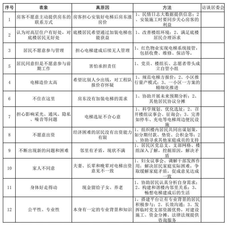 “受益最少的底层居民,到底在反对什么?受益最多的高层居民,为何也会不同意?口中说着‘担心电梯质量问题’的居民,实际上并非这么想”……既有多层住房加装电梯,最难的就是做群众工作。“半个月可以走完加梯审批流程,但前期可能要用一年、半年做群众工作”的情况并非个案。基层能否快速找到反对加梯居民的反对原因,通过群众工作引领业主做好协商,成为加梯提速的关键。 过去一年半,静安区临汾路街道实现了加梯“从1台到60台”的飞跃。在党建引领下,基层干部总结出来一套“临汾加梯群众工作经验法”:将不同意加梯的居民情况进行细致分类,找到不同意背后的“真实原因”,并提出对应处理方案。据此,基层干部在做群众工作时可以“春风化雨”说到居民心坎上,让居民乐意接受,也提高协商效率。以街道辖区内的临汾小区为例,2019年启动加梯楼宇17幢,达成100%共识平均用时仅两个月,个别居民协调平均上门次数从5次减少到0.5次。 这套“临汾加梯群众工作经验法”是什么?到底解决了哪些问题?记者日前采访了临汾路街道三位参与加梯工作的基层干部。 底楼居民“三大担心”如何解 在推进加装电梯工作中,让底层居民同意,似乎是道难题。 底楼居民到底在担心什么?“加梯后,可能影响到我家的采光、通风,上上下下的电梯还会产生噪音”“加梯获益的是高层居民,对底楼居民没有什么好处”“没加梯的时候,底楼不算差的楼层,但有了电梯,底楼成了最差楼层,我们的房价要跌了”。街道干部陈黛静告诉记者,底楼居民担心的问题主要可以归纳为以上三类。 基层干部不回避矛盾,找出底楼居民反对的真实原因,一一进行破解。“担心影响采光、通风以及产生噪音”,背后指向的是“电梯的选址”。基层干部带着底楼居民实地看其他楼组的加梯现场,让他们实际感受加梯后的采光、通风与声音,同时科学规划电梯选址,同步召开楼组议事会,让居民们商量着来。 在临汾路街道有幢老房,底层住着三户人家,1、2、3室依次排开。因为3室挨着旁边一幢楼房,在3室前加梯会涉及到旁边楼的居民,不太合适,因此设计师首选了靠近另一侧的1室位置。但1室居民提出,在这个位置加梯,正对着他家位于走廊内的一扇卧室窗,可能会影响采光。而如果加装在位于中间的2室前,电梯对着的是2室厕所的窗户,影响相对小一些。居委干部通过议事会在两户人家之间进行协调沟通,2室居民权衡利弊后,同意在他家前加梯。 到这里,“底楼”问题远远没解决。没有获得感,是一些底层居民的“藏在心底”的想法,街道通过改善底层楼组环境,让底层居民也有获得感。 在老公房小区——临汾小区,走进一个加梯楼组,一楼二楼公共走廊与楼梯让人眼前一亮:雪白的墙壁、干净的地面、新换的公共窗户,环境“秒杀”很多后建的商品房。“哪个楼组居民同意加梯,街道就出资对该楼组一二楼公共空间以及大门前公共空间进行美化。” 临汾小区一楼组。临汾社区提供 别小看这样的改造,在加梯后,由于楼上居民主要通过加装在楼组大门外的电梯上下楼,不再经过底楼,底层空间成了底楼居民的常用空间,这让底楼居民颇有“获得感”。 楼组有了电梯、楼道美化后,整体房价其实是提高的,房屋跌价问题也迎刃而解了。不久前,临汾小区一户底楼居民二手房屋挂牌,不到一周就出手了,房价比周边没有电梯的二手房底楼还要高一些。 高层居民为何也会反对 “我们走得动,不需要加梯,你们不用来问我了。”当居委干部上门征询意见时,没想到遭遇一户住在高层的老年居民的反对。而邻居们经常看到,老人拉着小孙子颤颤巍巍上楼,“一老一小”都非常需要电梯。 加梯受益最多的高层居民为何不愿意加梯?基层干部发现背后原因:大多与出资有关。 新华社图片 闻喜路251弄居民区党总支书记周莉说,有些老年居民家庭生活困难,又住在高层,他们担心:一旦加梯,自己出资比例较高,无法负担。但碍于面子,这些居民不肯说出真实原因。每次居委干部上门做工作,这些居民会以“不需要”来推辞。 于是,周莉与居委干部有针对性地做群众工作。如,针对这户高层老年居民的情况,与有愿意加装电梯的楼内居民商量。最终,有居民提出愿意无偿为这户人家垫付加梯款,这户人家可以按照偿还能力分期偿还。居委干部和楼组长等再上门动员这户人家,分析“一老一小”的需求,畅想电梯建成后的生活:“没有电梯,以后生病了怎么办?你家小孙子会不会说‘我也想坐电梯?’”解决了出资的后顾之忧,思想工作又做进老人的心坎里,出资加梯问题迎刃而解。 家庭矛盾,也可能成为高层居民不愿意加梯的原因。一户高层人家住着三代人,婆婆与媳妇很明确地告诉居委干部:家人不同意。 居委干部了解到,这户人家经济条件并不差,家中的“一老一小”也有加梯需求,但为何他们会不愿意加梯?经了解,婆婆与媳妇存在矛盾,双方都希望对方出钱加梯。 了解到真实原因后,居委干部做工作就有的放矢了。得知这户人家的小朋友存在入托难问题,居委干部在政策准许范围内,帮助他们解决了孩子入托的问题。解决了这户人家最大的烦心事后,家庭矛盾得到了一定缓解,媳妇最后主动提出愿意出资加梯。 遇到“口中说的和心里想的不一样”居民怎么办 “居民口中说的和心里想的不一样”,这是基层干部在推动加梯中碰到最