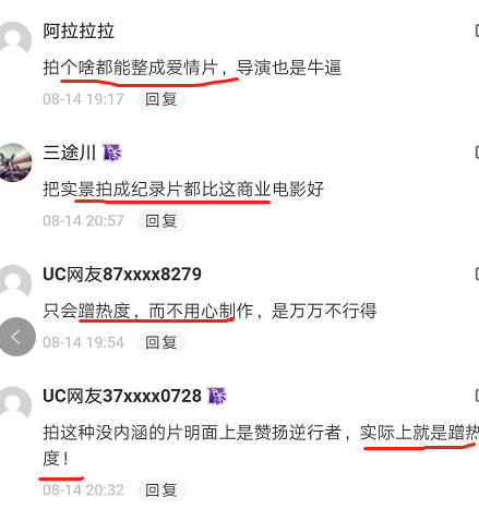 8月10日,首部反映我国抗击新冠肺炎疫情英雄事迹的电影《最美逆行》在爱奇艺、优酷、腾讯三大网络平台播出,该片名由德高望重的钟南山亲笔而题,在里面钟南山也以纪录片的形式出现在电影中,此外程铮、启杰领衔主演,郭冬临、程煜、迟志强、赵亮等明星特邀出演。 据说很多演员是零片酬出演,这点我们应该给予点赞。 本来观众寄予厚望,但《最美逆行》上线四日,三大平台相加不过160万左右,而豆瓣平台上几乎全是差评。 那么为什么导致票房口碑惨败呢? 我觉得影片与其说是一部电影,不如说是一部短片的集合,有些还是引用的纪录片,真正有意义有价值的内容太少,整部影片看起来生硬尴尬无聊无趣。没有把逆行者那种迎难而上的精神体现出来,没有把疫情的残酷展现出来,反而让观众觉得是疫情期间一段爱情故事,说是一部爱情片都不为过。 首先把整个抗疫的主线变成了“爱情”,这本身就把格局给拉低了档次,再者感觉全剧都是漏洞,就比如给大家印象最深的就是小女孩扯下护士的口罩,导致护士被感染死去,护士被扯下口罩的第一反应不是跑出去,而是捂着自己的嘴,拜托啊,你的手都碰过多少病人了,还敢去捂自己的嘴,作为一名医护人员,首先就不够专业,另外医护人员不应该戴n95口罩吗?这是为了剧情,生拉硬拽啊 另外就是在如此紧张的抗疫时刻,主任在办公室居然不戴口罩,主任你可真是勇士啊,是嫌自己感染得不够快吗? 而且明明是抗疫剧,但是却没有大量病人被感染的镜头,大多数内容是把一些影响镜头和新闻报道内容结合起来,感觉像是一部记录片的合集 更好笑的是剧中女演员全程淡妆,整天穿着防护服的她们连妆都没有脱,这可能吗?说到抗疫时都是豪情万千,但是通篇下来关于疫情紧张的镜头没有几个,完全体会不到抗疫的紧张气氛 整部电影看下来,似乎只有郭冬临饰演的李文亮比较出彩,一句幽默的话既化解了尴尬,又让大家在紧张之余难得有了一丝笑容,将抗疫人员连日来的疲惫和困倦在这一刻得到了放松! 网友评论: