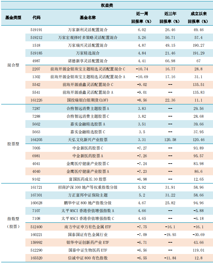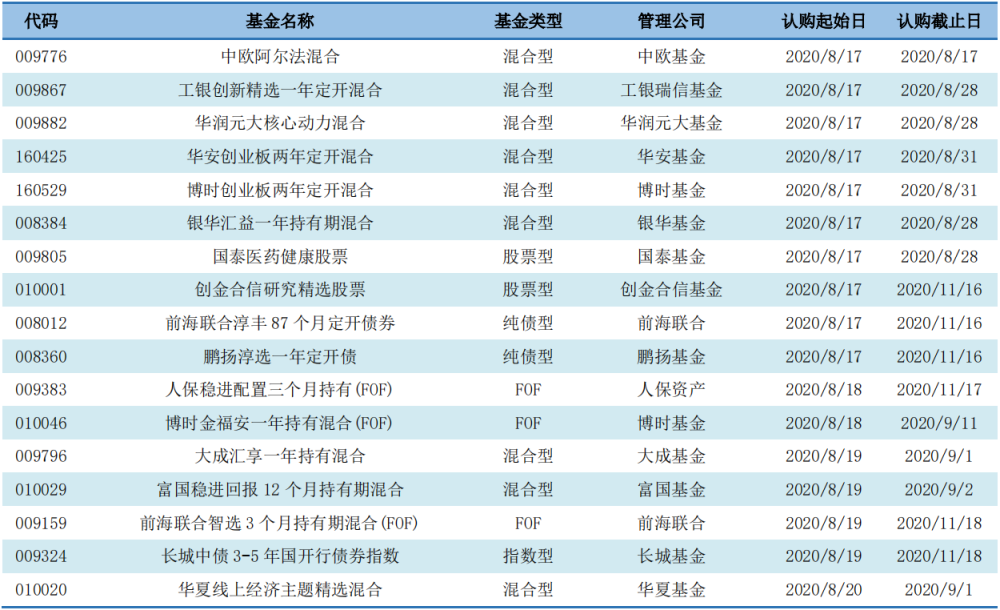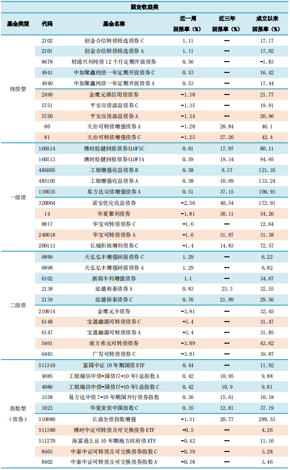 基础市场概况 图1:指数动态(08.10—08.14) 数据来源:济安金信基金评价中心 上周(08.10-08.14)A股市场延续震荡,主要股指明显分化,深成指及创业板指走弱,上证指数在权重股带动下基本走平,两市日均成交量大幅萎缩。板块方面,申万一级行业中,房地产、银行及交通运输板块近一周涨幅居前,有色金属、医药生物及休闲服务近一周跌幅居前。 资金方面,上周资金面偏紧,央行整周通过公开市场操作投放货币5000亿,到期100亿,累计净投放金额4900亿,银行间货币市场利率明显上行。债券市场有所回暖,但仍延续震荡,利率债及信用债收益率小幅下行,转债指数因权益市场陷入震荡整周下跌。 各类型基金业绩表现 (1)权益类基金 上周股市缩量震荡整体偏弱,不足半数主动权益类基金(包括股票型、混合型基金)及被动权益类基金近一周净值收益上涨,其中,股票型基金近一周平均净值收益为-1.45%,混合型基金近一周平均净值收益为-0.89%,股票指数型基金近一周平均净值收益为-0.37%,总体来看主动投资基金表现不及指数。 个基表现方面,上周消费及金融地产板块走强,重配相关行业个股的基金收益涨幅居前;而受消息面影响贵金属价格迅速回调,医药、有色板块大幅走弱,相关主题投资基金表现不佳。 表2:上周各权益类基金收益表现(涨幅前5位及跌幅前5位) 数据截止日期:2020年8月14日 数据来源:济安金信基金评价中心 注:基金收益统计剔除ETF联接基金、因巨额赎回等出现净值异常的基金,不同份额分别计算。 (2)固定收益类基金 流动性方面,上周资金面整体偏紧,货币市场利率有所上行,货基平均收益较前一周小幅回升。上周货币基金平均七日年化收益率为1.7342%,较前一周小幅上涨0.0105%,不足两成基金七日年化在2%以上(不同份额分别计算)。 债市上周有所回暖,利率债及信用债收益率小幅下行。九成纯债型基金近一周净值收益为正增长;受权益市场拖累,不足半数一级债和二级债基金近一周净值收益上涨。 表3:上周固定收益类基金收益表现(涨幅前5位及跌幅前5位) 数据截止日期:2020年8月14日 数据来源:济安金信基金评价中心 注:基金收益统计剔除ETF联接基金、因巨额赎回等出现净值异常的基金,不同份额分别计算。 (3)QDII基金 外围市场方面,欧美主要股指延续震荡向上趋势;除台股外,亚太地区主要市场基本走强。截至8月14日已公布的净值数据显示,投资于海外市场的QDII基金近一周净值收益涨跌各半,平均涨跌幅为-0.87%。由于交易时间、交易机制等不同,投资者在投资QDII基金前需充分了解其运作所面临的各项风险,审慎做出投资决策。 表4:上周各海外基金收益表现(涨幅前5位及跌幅前5位) 数据截止日期:2020年8月14日 数据来源:济安金信基金评价中心 注:基金收益统计剔除ETF联接基金、因巨额赎回等出现净值异常的基金,不同份额分别计算。另外由于国际市场交易结算时间不同、业绩披露频率不同等原因,QDII基金在统计日无净值披露的使用最近一期净值披露数据。 新发基金统计 上周共有12只新发基金开始认购,截至8月14日累计募集份额98.86亿份,按基金类型来看,新发基金中混合型基金9只,股票型基金2只,指数型基金1只。 本周新发基金信息如下表所示。 表5:本周新发基金概览 风险提示及免责声明 市场有风险,投资需谨慎。基金的风险收益特性与银行存款、债券等投资工具不同,投资人所持有的基金份额可以分享基金投资所产生的收益,也可能承担基金投资所带来的损失,并不构成业绩保障。因此投资者需审慎评估自身的财务状况及风险承受能力,并选择与之相匹配的基金产品进行投资。 基金作为一种投资工具,其过往业绩并不代表未来表现。基金净值表现的短期波动难以预测,建议投资人不要过于关注基金的短期业绩,而是追求长期资产的长期稳健增值。 本报告所载的全部内容均基于已公开的市场信息,但不保证该等信息的准确性或完整性。在任何情况下,本报告中的信息或所表述的意见不构成对任何人的投资建议。